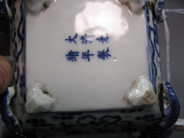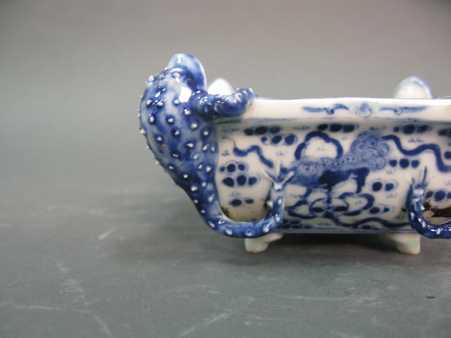 Group lot small blue and white dragon incense burner having three feet with mask on each and two handles painted with geometric border and dragons, small paint decorated square vase painted with two sides of characters one side with bamboo and one side with wild flowers and square blue and white tadpole bowl having four tadpoles one on each corner and painted monkeys on each side.