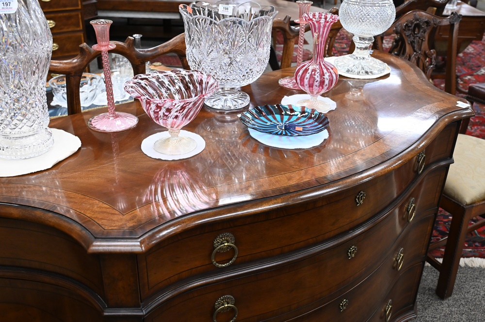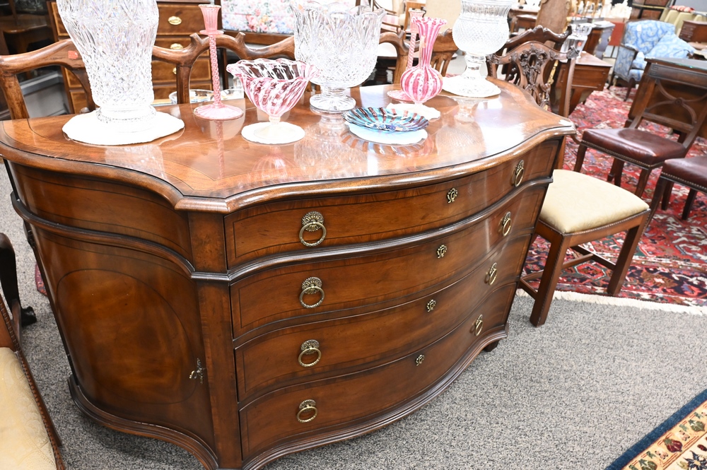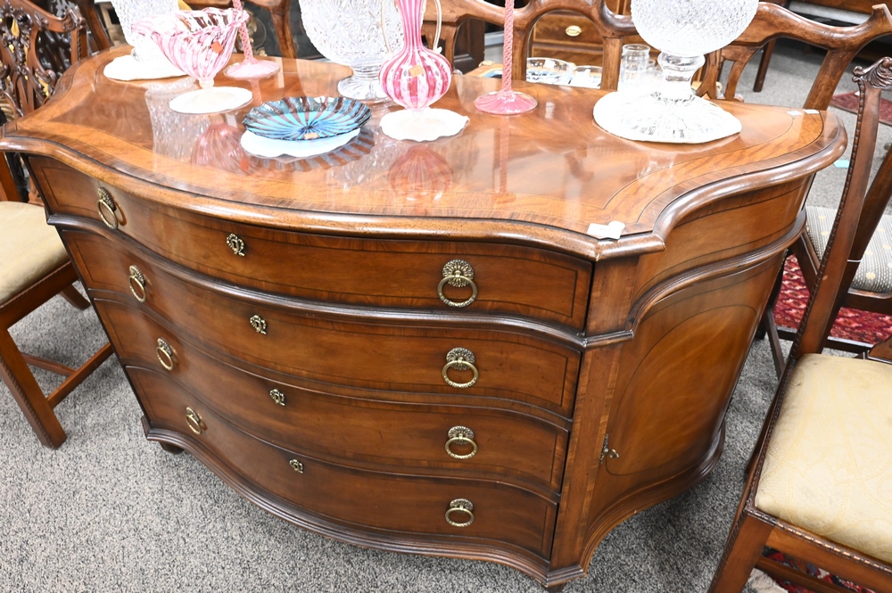 Lot 352: Henredon Oxford Classics Banded Inlaid Server, having four drawers with a fitted silver drawer, height 36 inches, top 26″ x 66″.