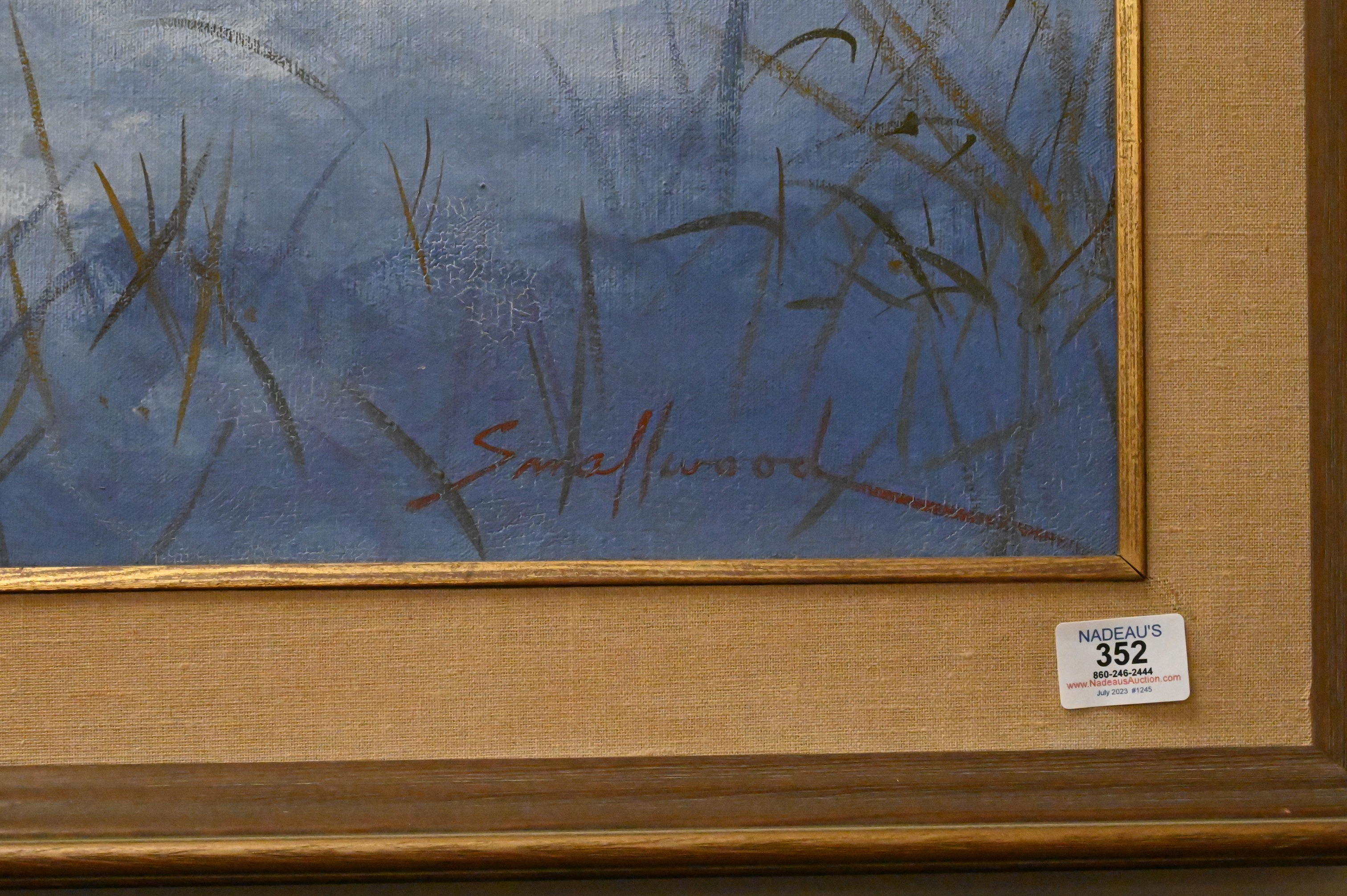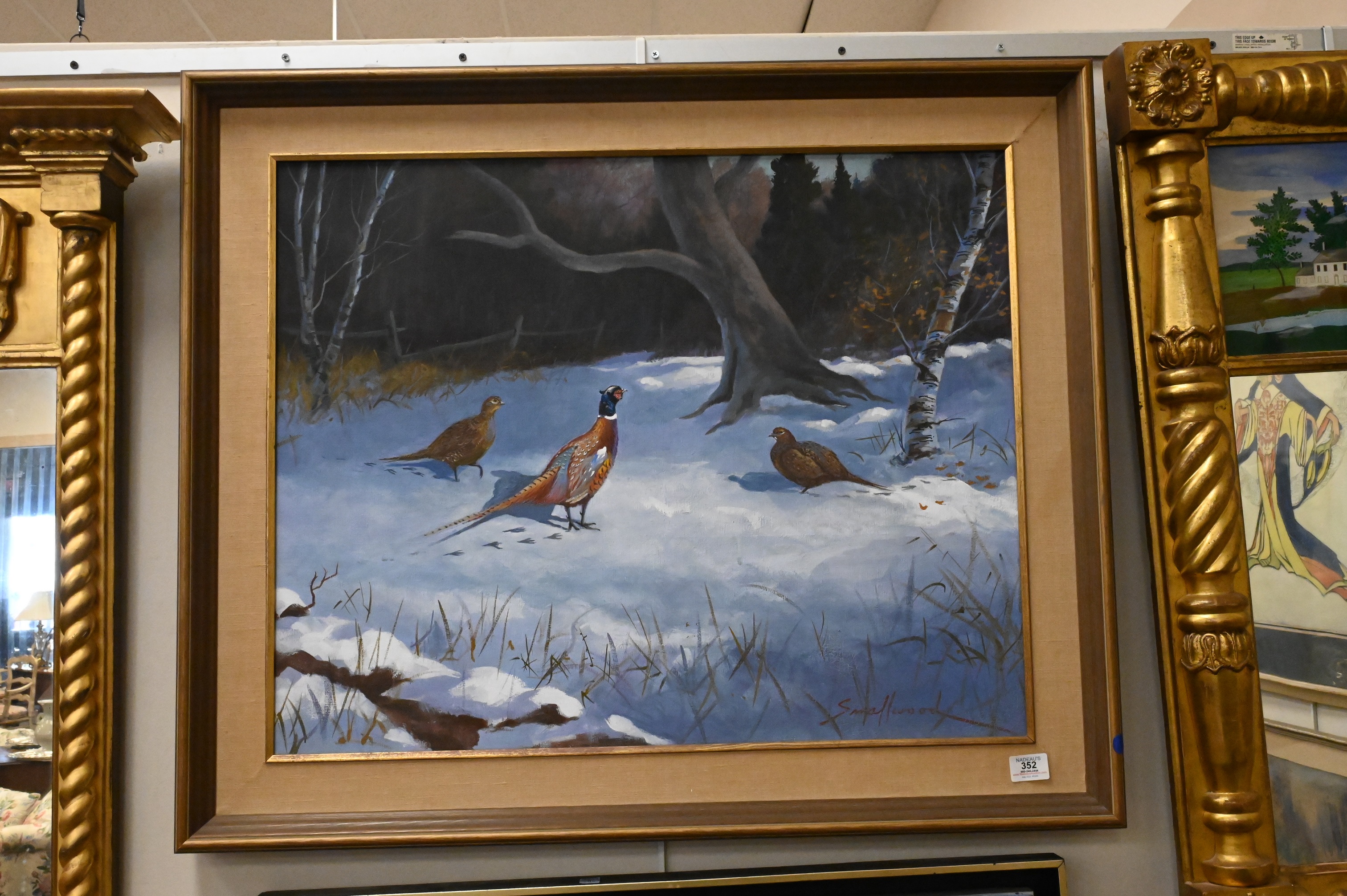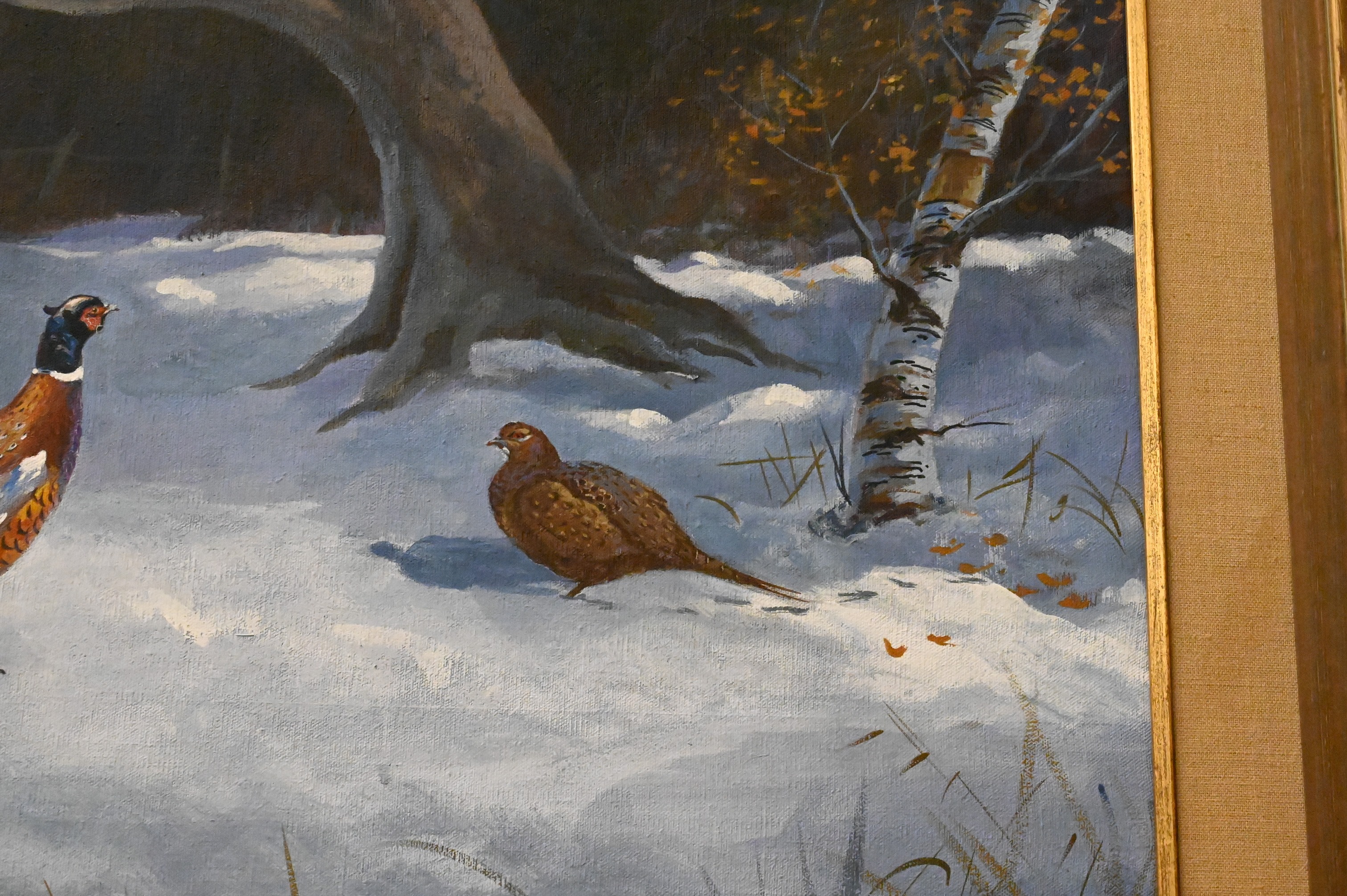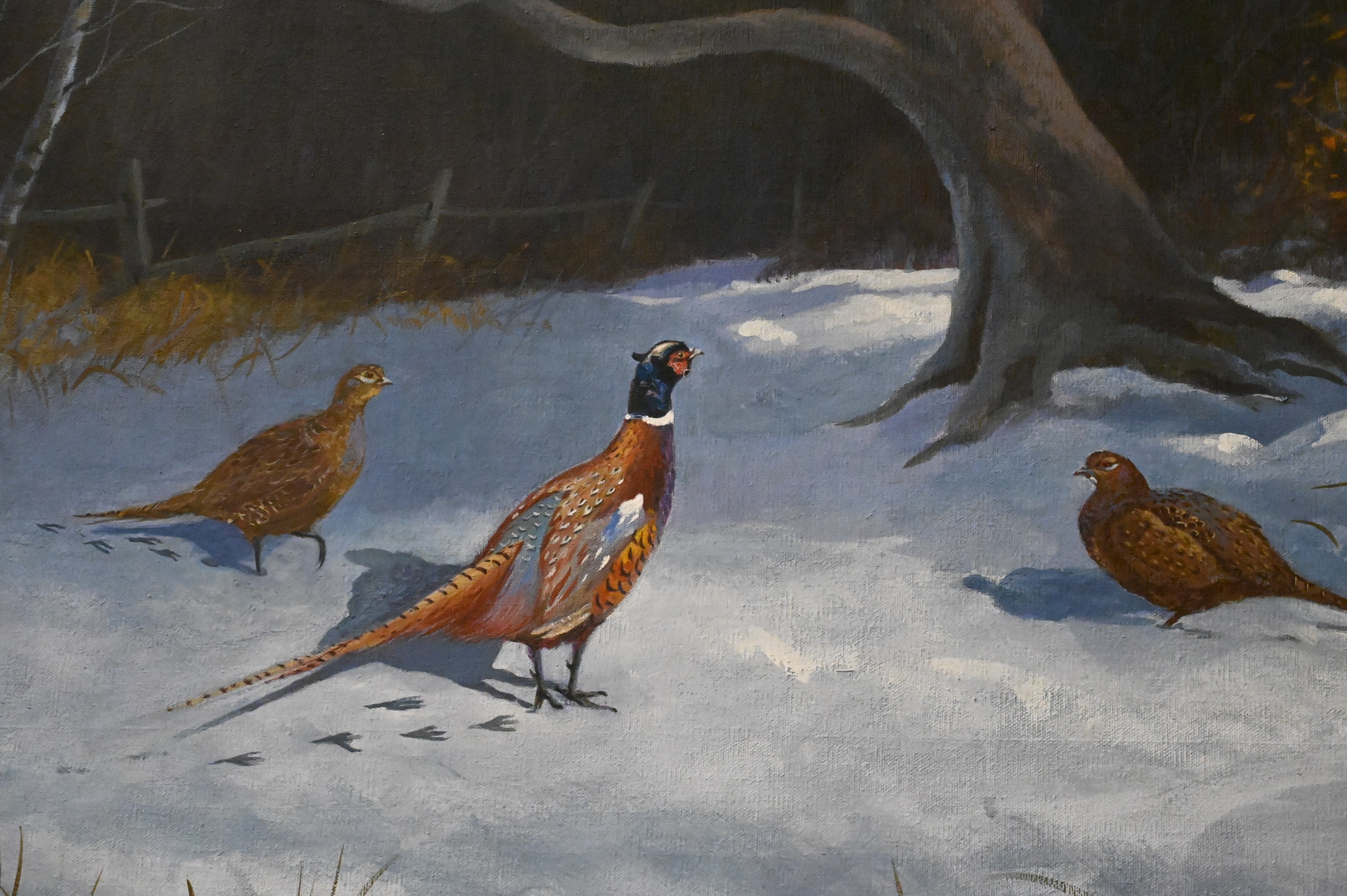 Kenneth Smallwood (American 20th Century) “Autumn Snow – Pheasants” oil on canvas small wood lower right The Sportsman’s Gallery label on verso 30″ x 24″