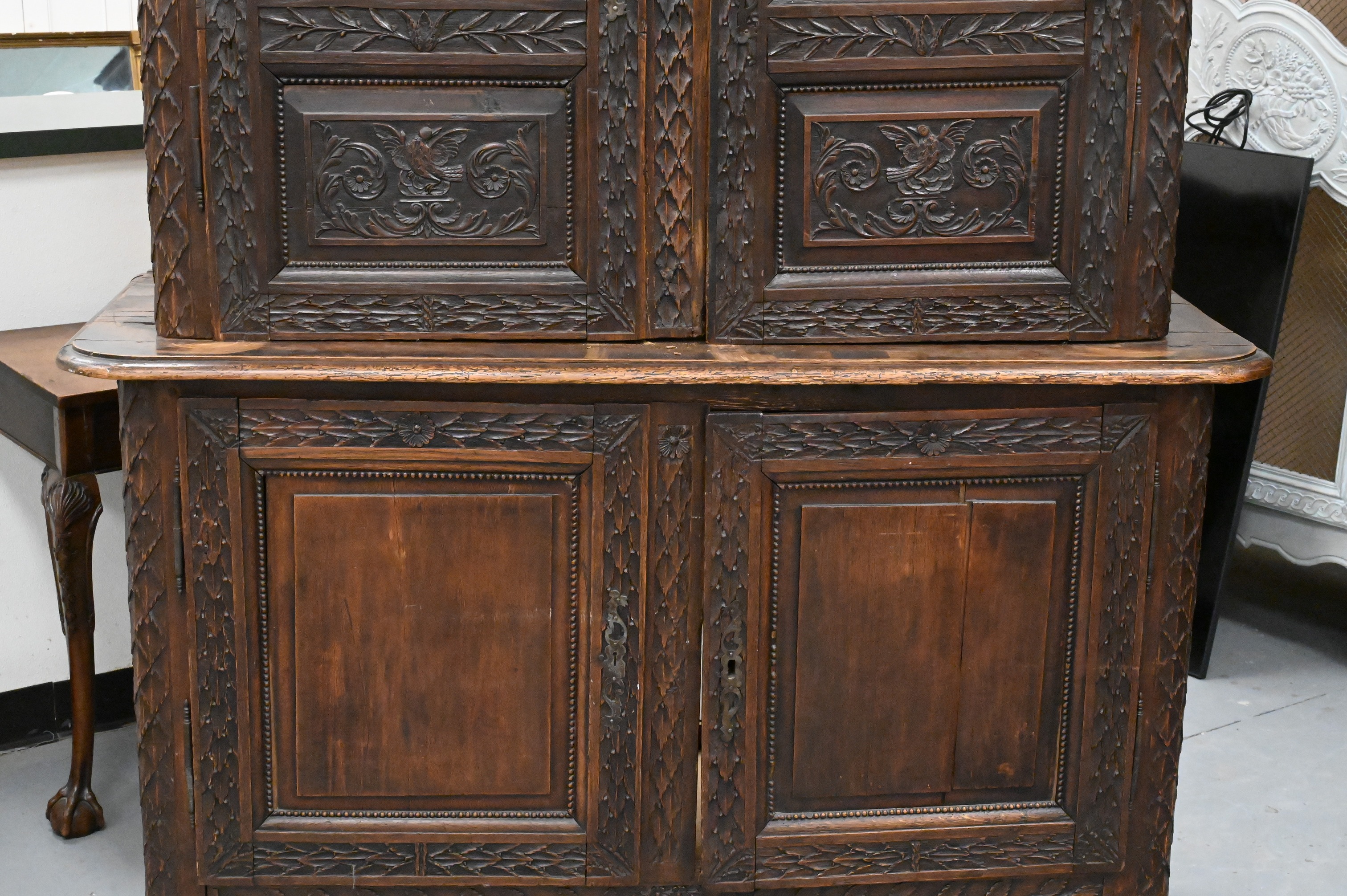 in two parts, top having two doors opening to interior shelving, set on base having two doors set on cabriole legs