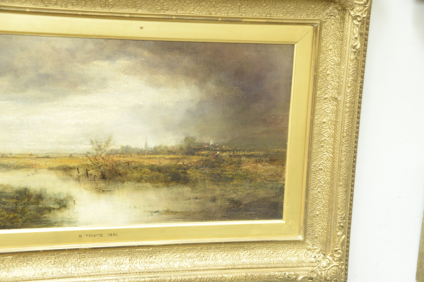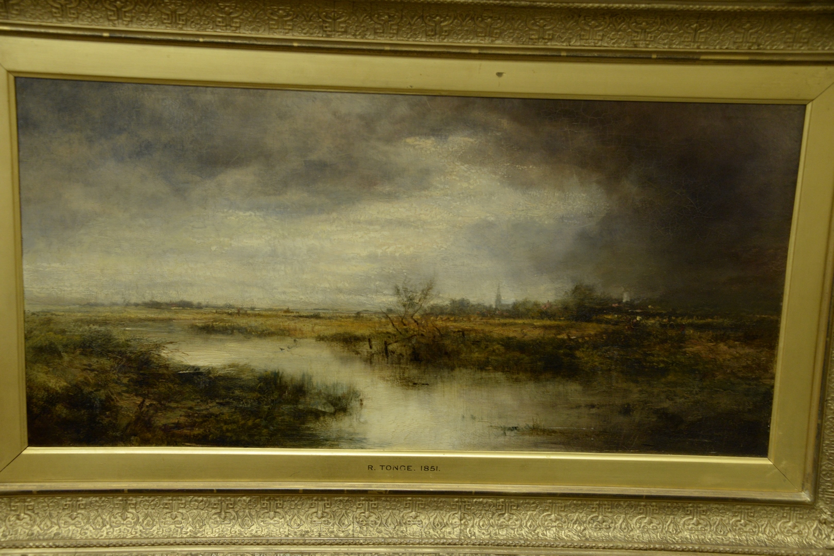 Robert Tonge British, 1823 – 1856 Marsh-side Landscape, 1851, oil on glue lined canvas, signed and dated lower left R. Tonge, 1851, 14 1/4 x 28 1/4. Provenance: Hallam Gallery, London acquired from the above by present owner, 1988.