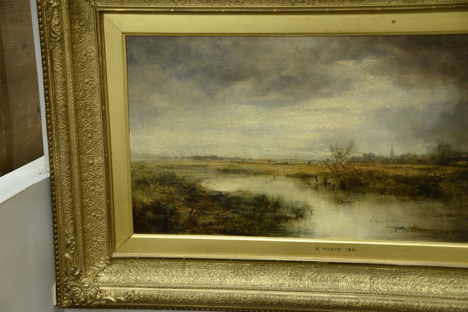 Lot 352: Robert Tonge British, 1823 – 1856 Marsh-side Landscape, 1851, oil on glue lined canvas, signed and dated lower left R. Tonge, 1851, 14 1/4 x 28 1/4. Provenance: Hallam Gallery, London acquired from the above by present owner, 1988.