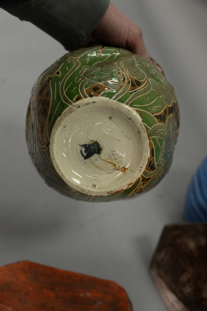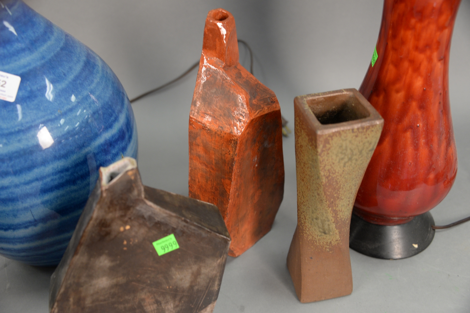 Lot 352: Six glazed Mid-Century pottery pieces including red glazed vase made into a lamp, blue glazed vase made into a lamp, red glazed pott…