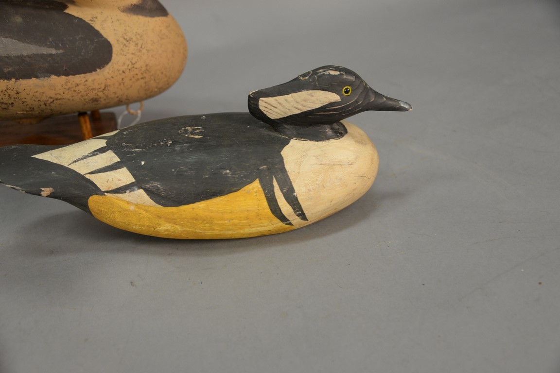 Three carved and painted duck decoys including a mallard hen marked Walker, canvasback drake signed by Ernest Steck, and a hooded merganser drake. lg. 13 1/2in. to 14 1/2in. Provenance: Property from Credit Suisse’s Americana Collection