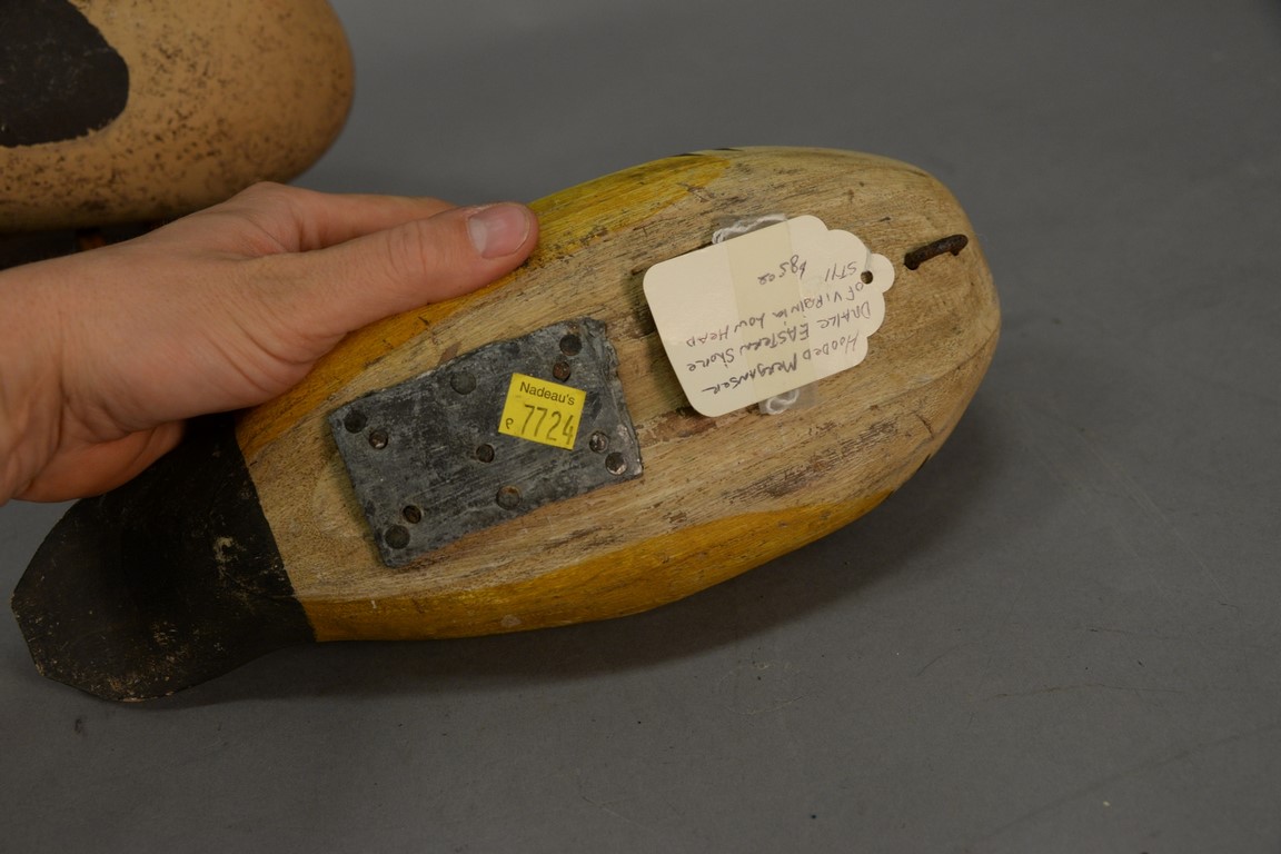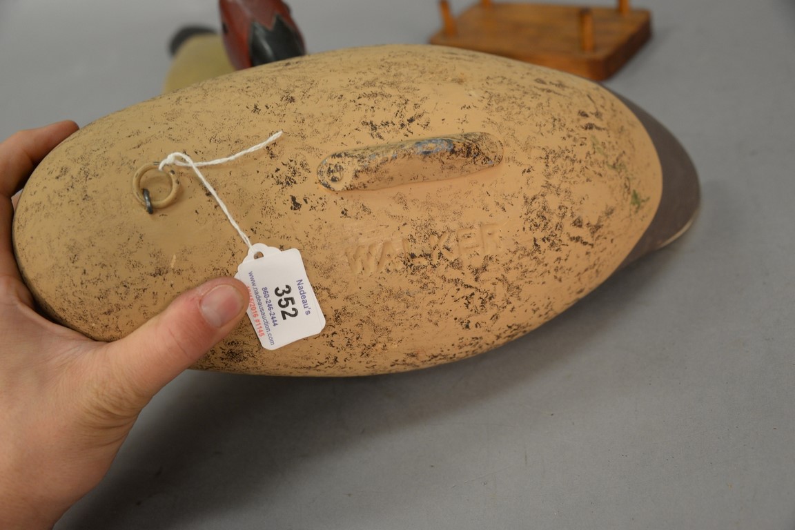 Lot 352: Three carved and painted duck decoys including a mallard hen marked Walker, canvasback drake signed by Ernest Steck, and a hooded me…