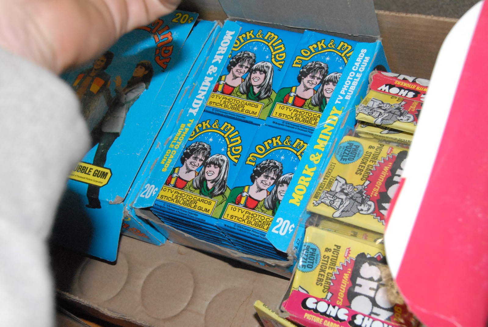 Unopened packs of Gong Show cards and Mork & Mindy cards
