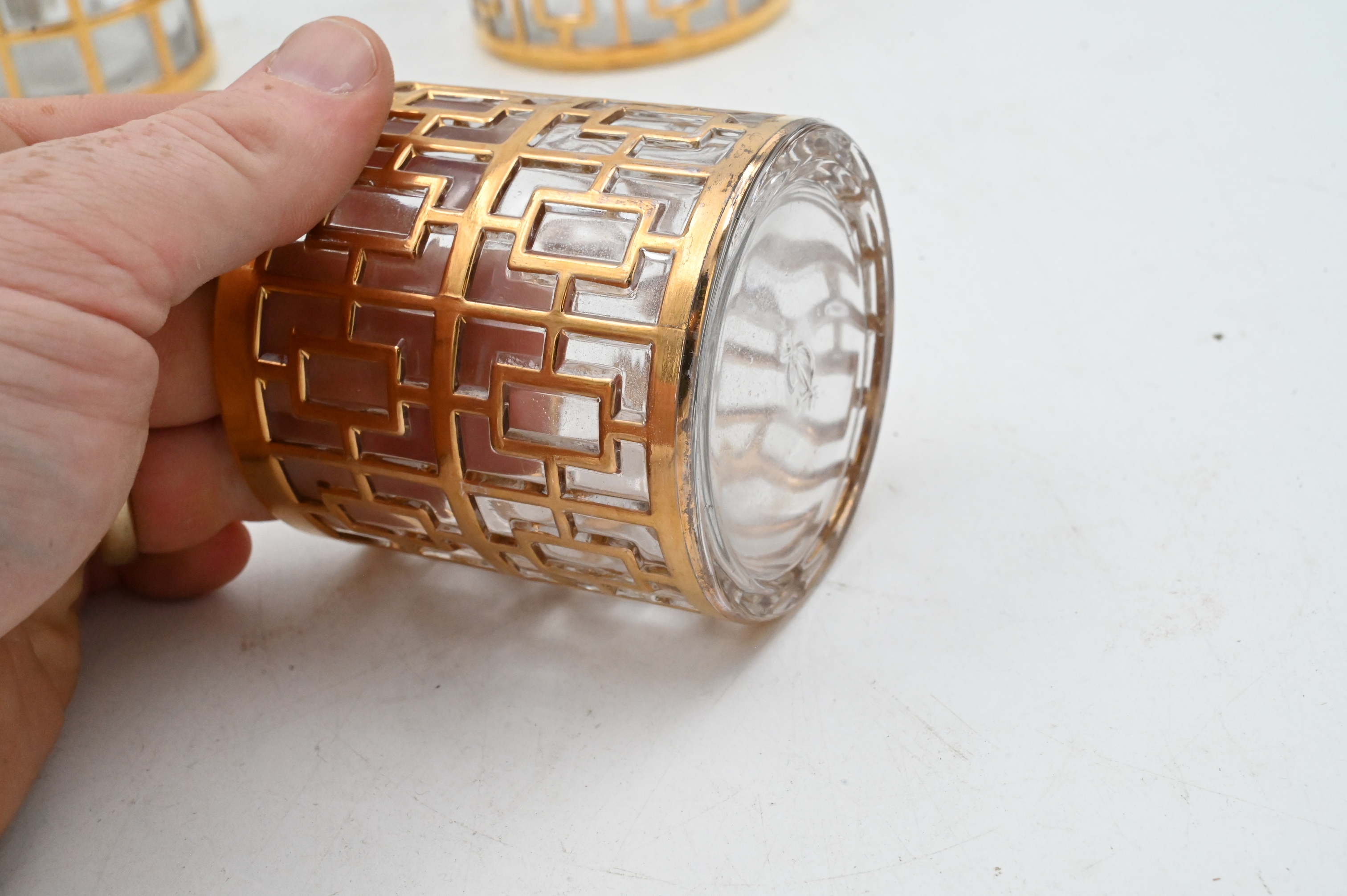 11 “Toril de Oro” highball glasses, 8 highball glasses, 8 whiskey glasses, 6 cocktails, along with an ice bucket in “Shoji”, each plated in 24K gold fretwork overlay, marked on underside