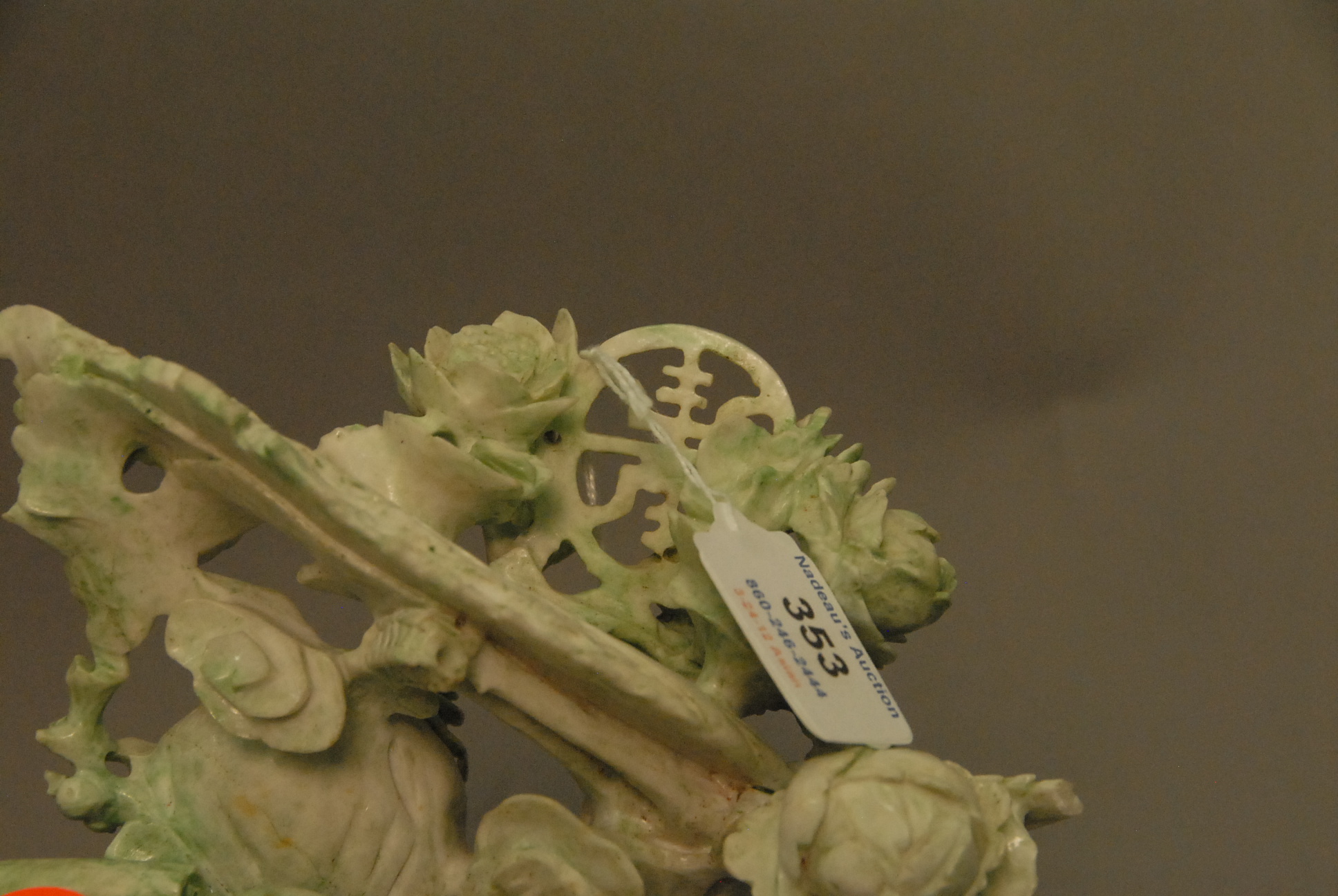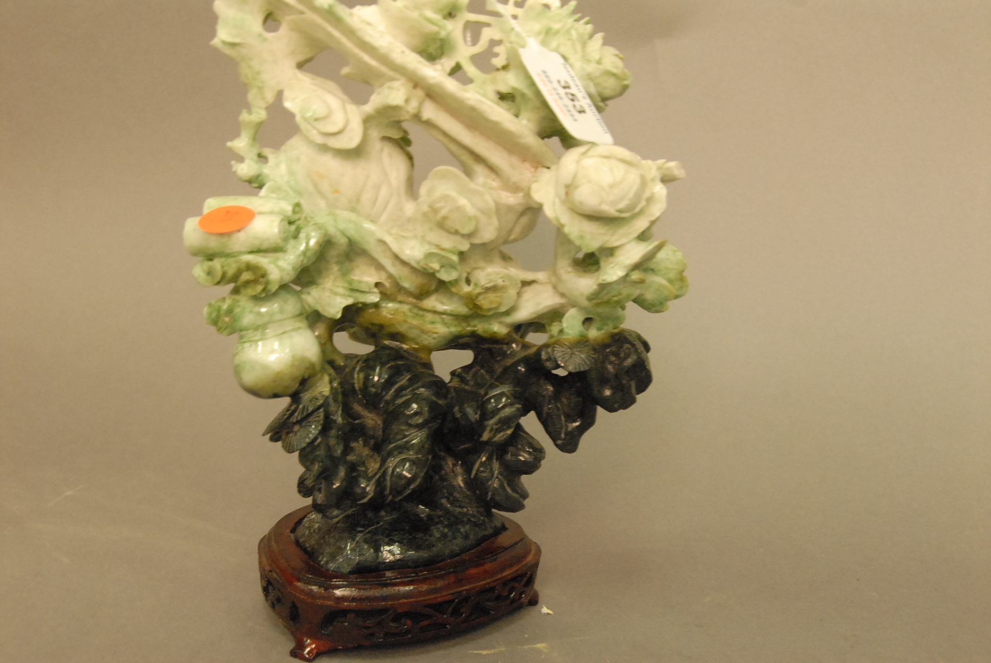 Lot 353: Carved hardstone figural sculpture having scholar amongst flying phoenix bird with wild flowers and pine trees, ht. 8 1/2.