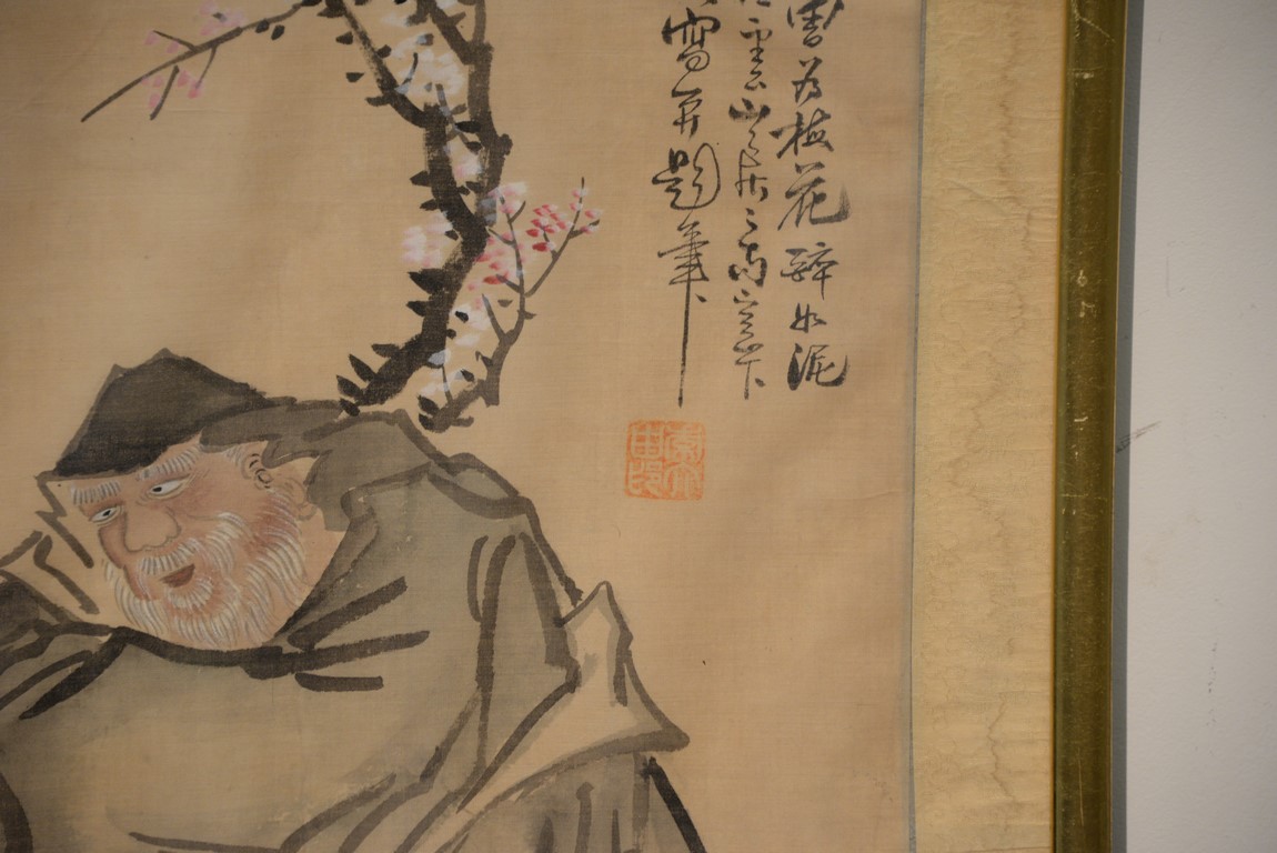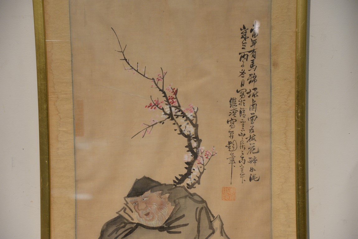Chinese oil on silk painting of scholar carrying a branch from a blossoming tree. image size 41 1/4 x 15 1/4 total size 49 x 18