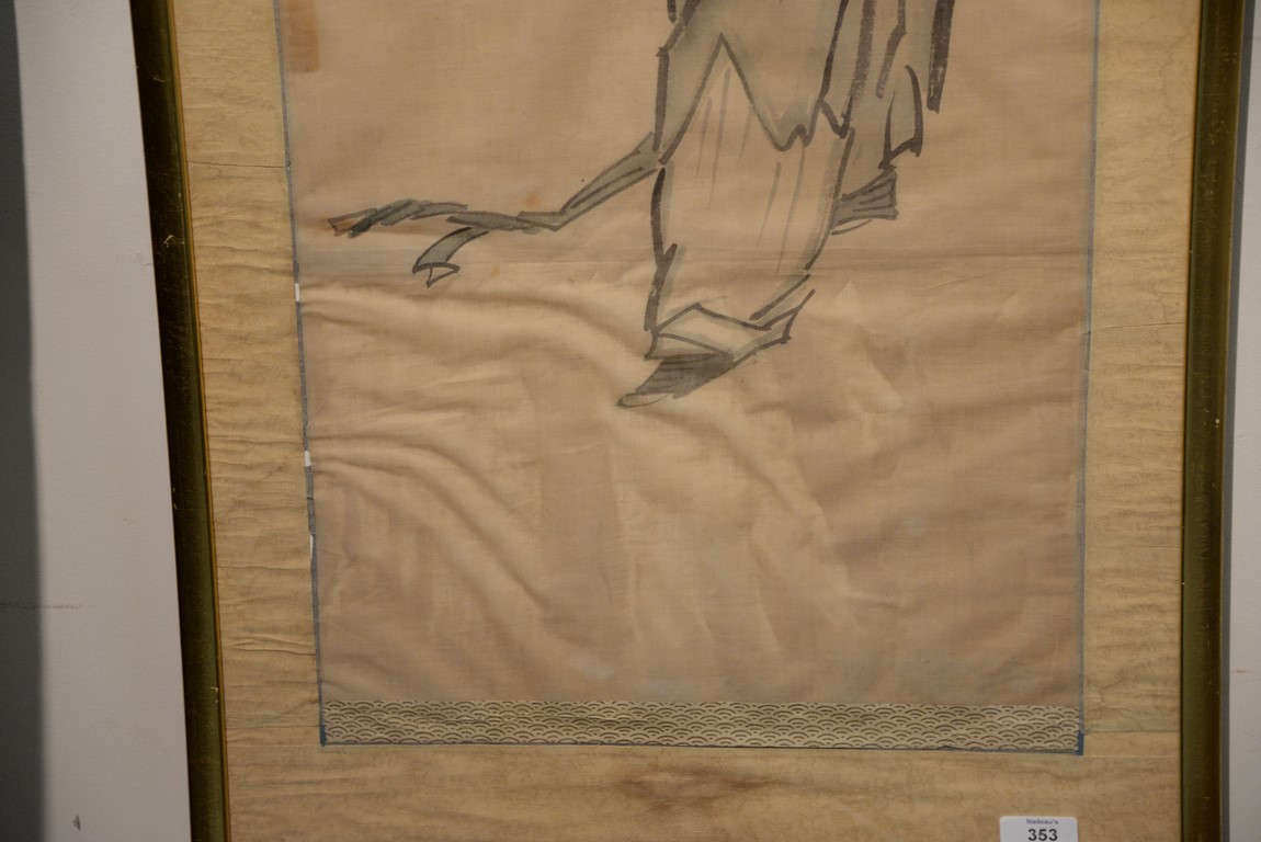Lot 353: Chinese oil on silk painting of scholar carrying a branch from a blossoming tree. image size 41 1/4 x 15 1/4 total size 49 x 18