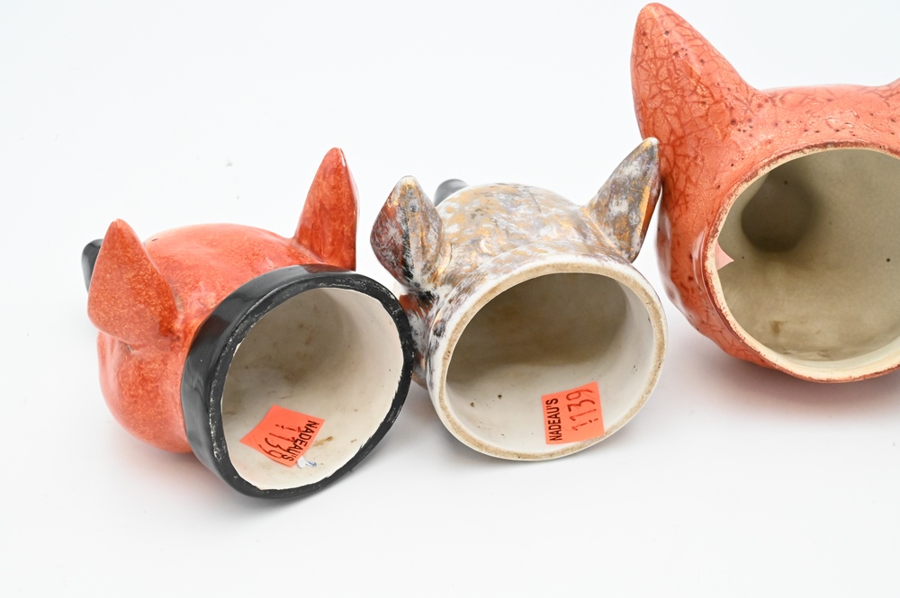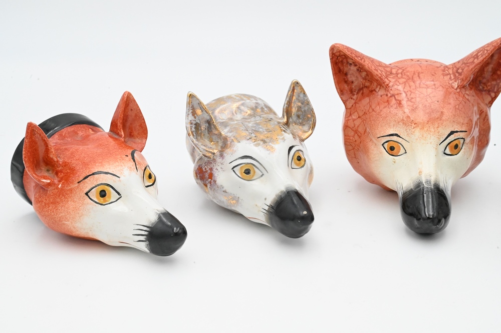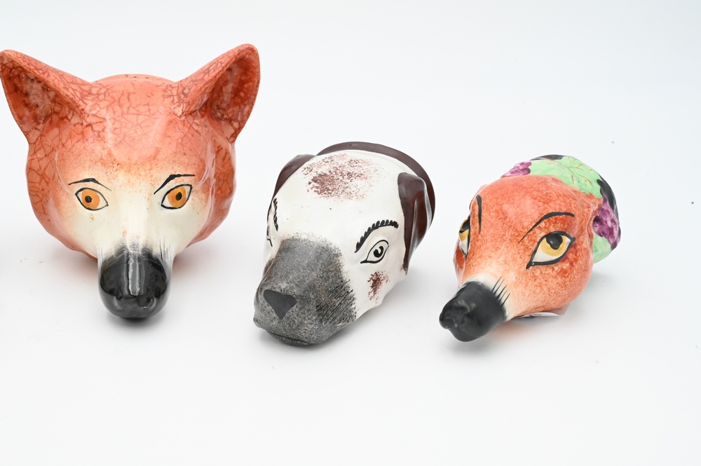 Lot 353: Collection of Five Staffordshire Stirrup Cups, in the form of fox and dogs, tallest 5 inches.