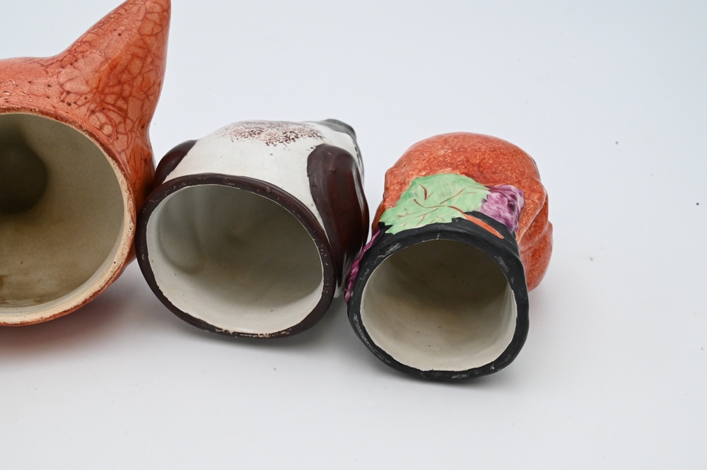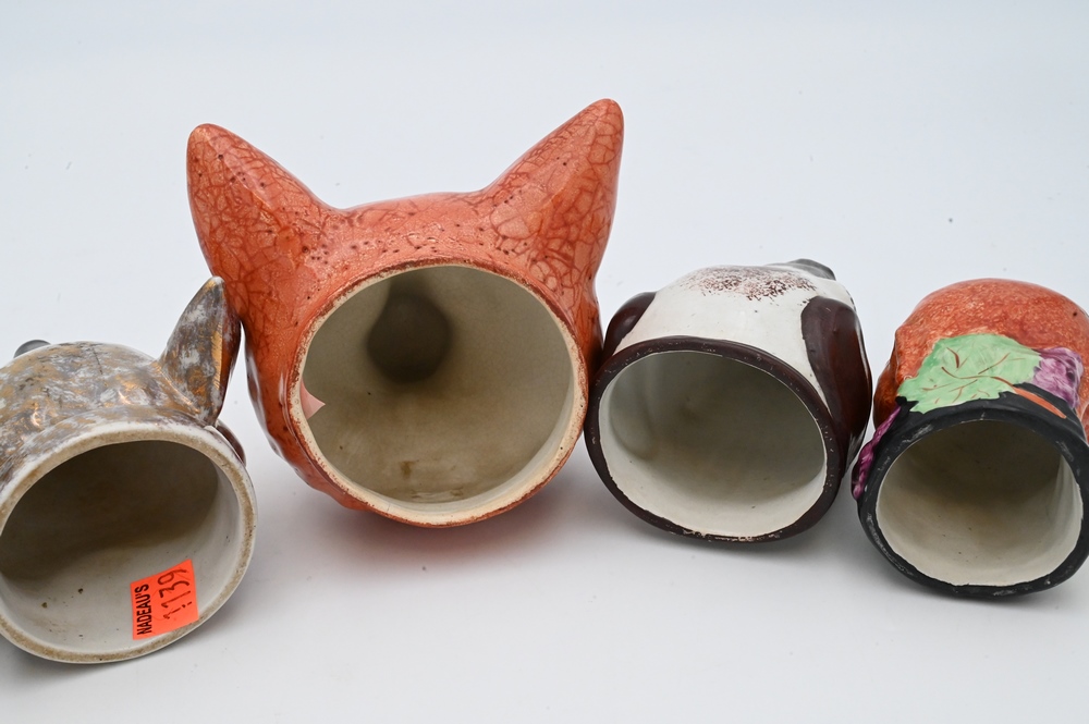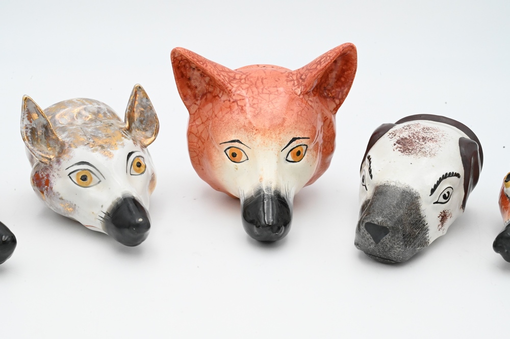 Collection of Five Staffordshire Stirrup Cups, in the form of fox and dogs, tallest 5 inches.