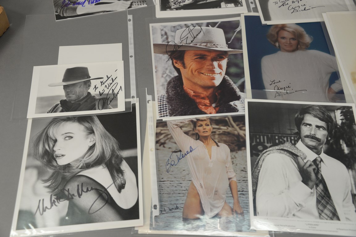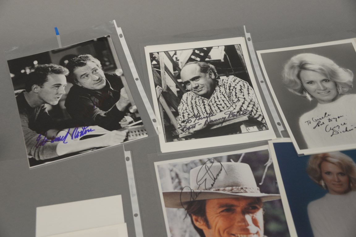 Group of 46 photographs, 26 are autographed including 1 Vic Damone, 1 Bette Davis, 2 Arlene Dahl, 3 Sandra Dee, 1 Bo Derek, 1 Neil Diamond, 1 Gloria DeHaven, 1 Rebecca De Mornay, 3 Robert DeNiro, 1 Danny DeVito, 1 Bradford Dillman, 3 Angie Dickinson, 1 Kevin Dobson, 1 Leslie Ann Down, 1 Faye Dunaway, 3 Clint Eastwood, and 1 Sam Elliot and 20 unsigned photographs to include 2 Arlene Dahl, 5 Sandra Dee, 2 John Derek, 4 Bo Derek, 1 Vera Ellen, and 6 Sam Elliot.