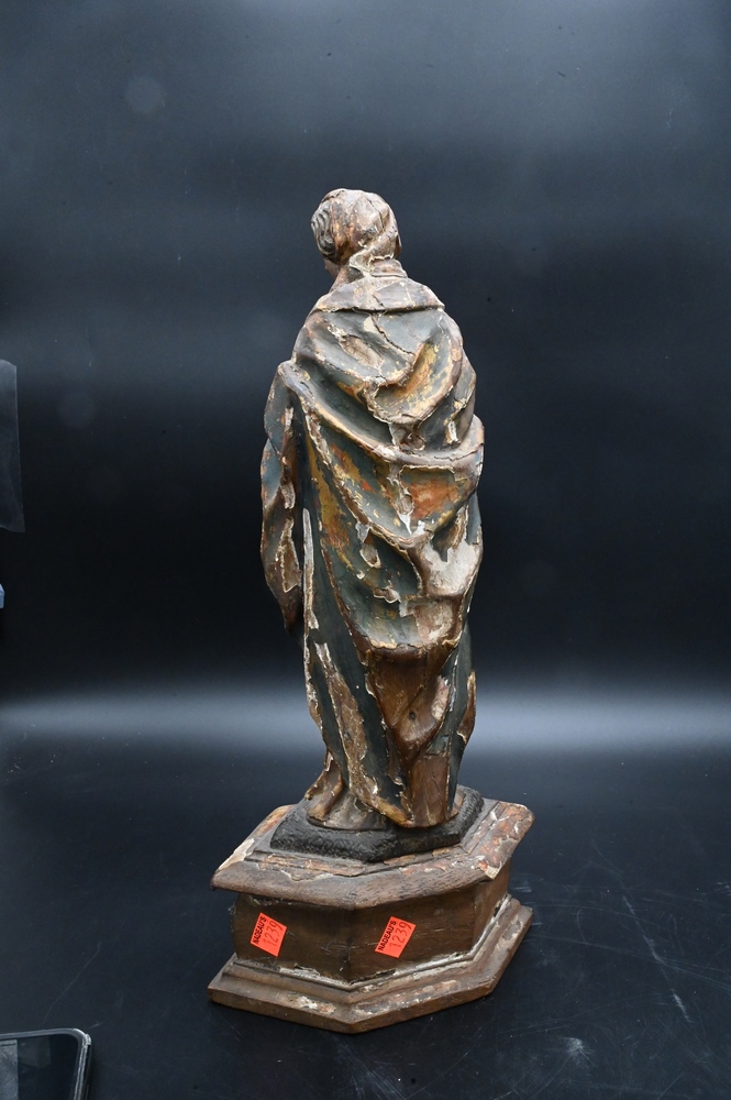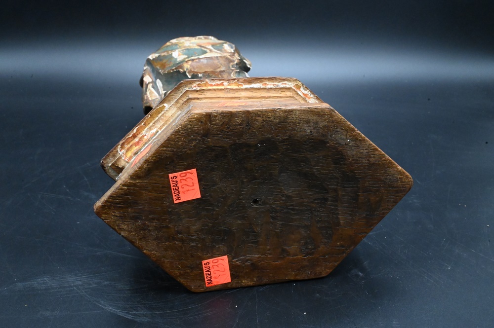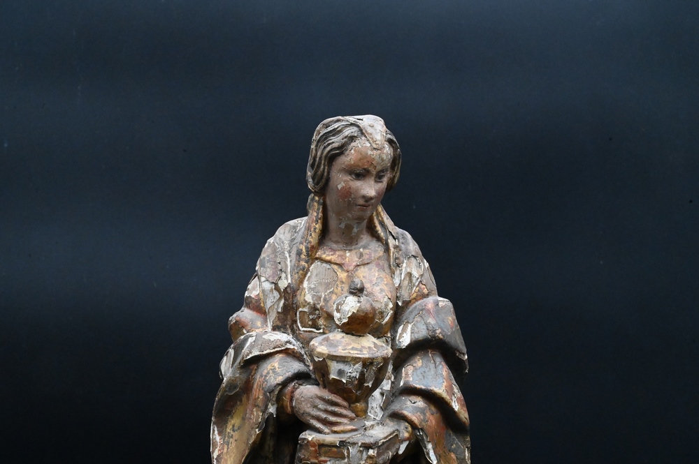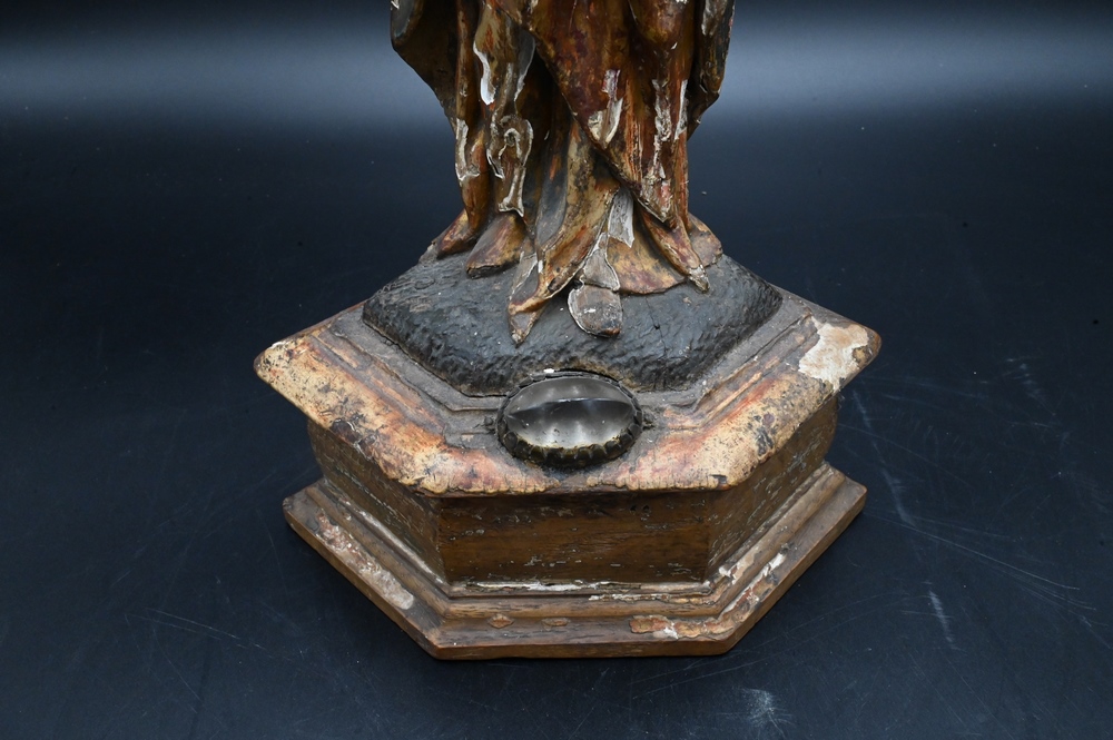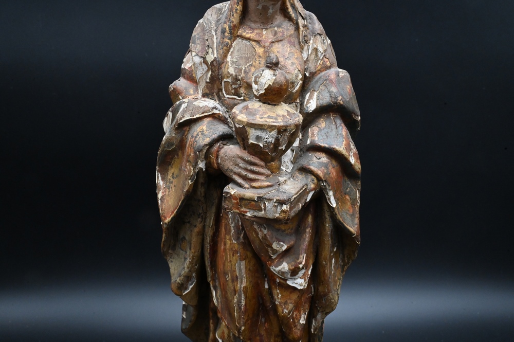 Italian Polychrome Painted and Gilt Gesso Carved Wood Figure, Virgin Mary holding an urn on pedestal base, height 17 inches.