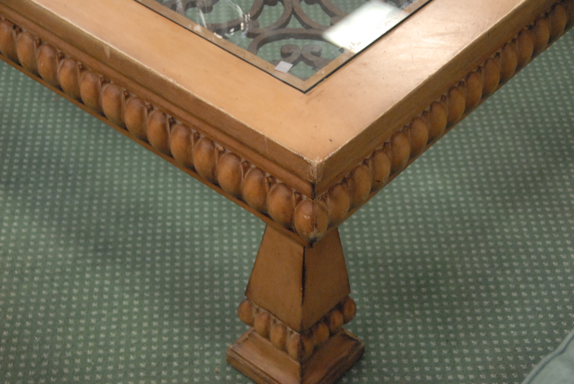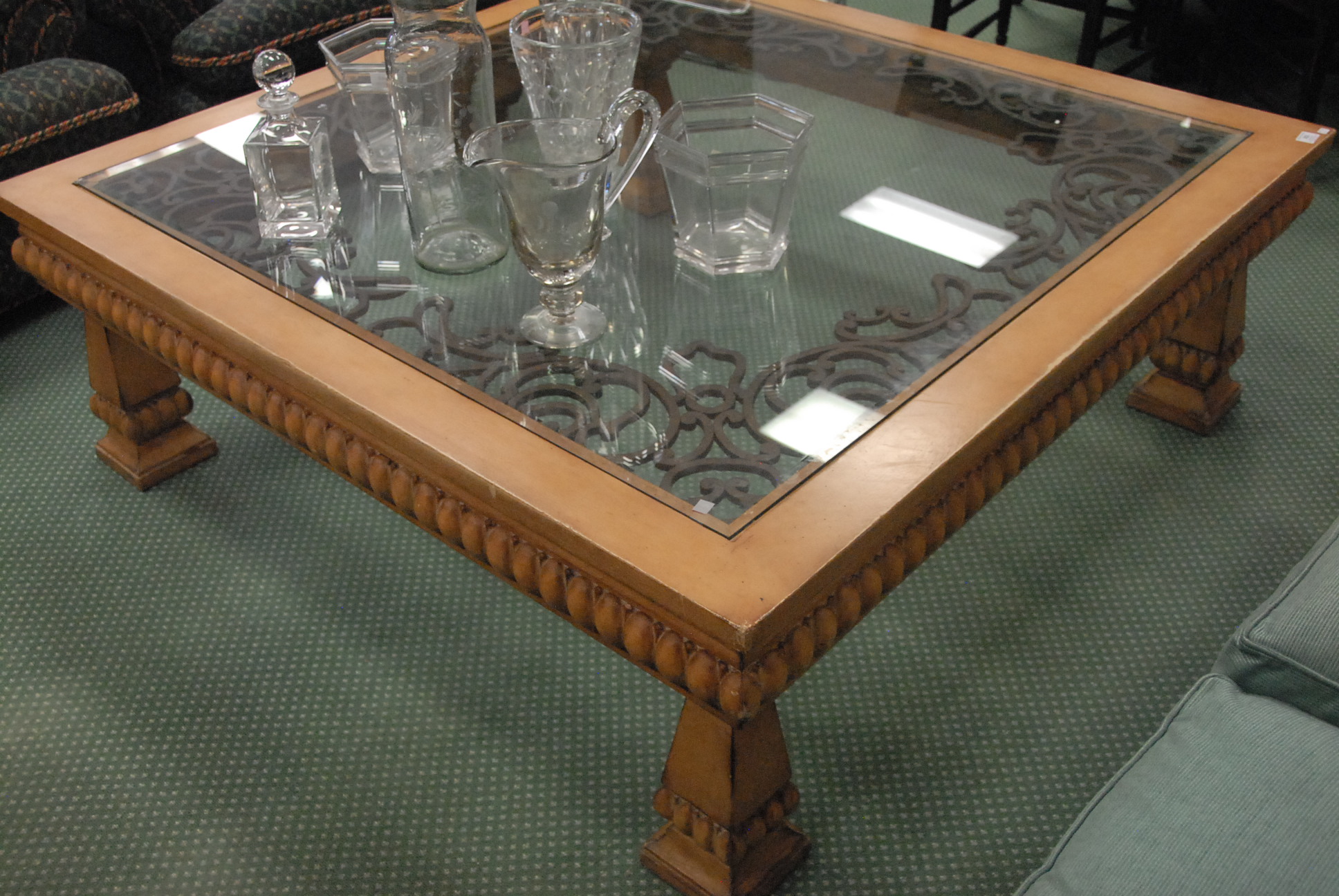 Large glass top coffee table, ht. 21 in. top: 58 x 58.