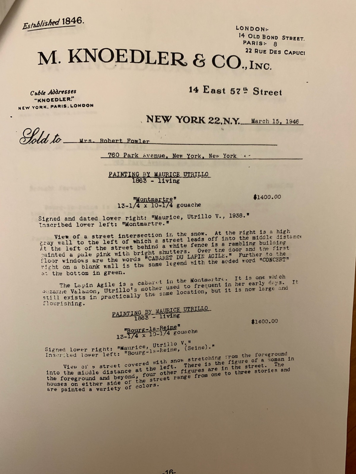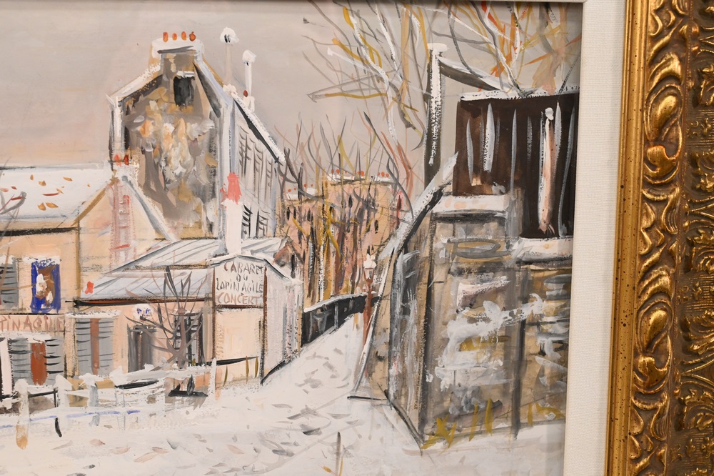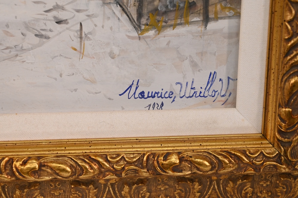 Maurice Utrillo (1883 – 1955), Le Lapin Agile Sous La Neige, Montmartre winter landscape, gouache, signed and dated lower right Maurice Utrillo V. 1938, titled lower left Montmartre, Superior-Paris stamp lower left corner, tack holes in corners, sight size 9 1/2″ x 12 1/2″, paper size 9 3/4″ x 12 5/8″, Original 1946 M. Knoedler and Company Gallery Receipt. Provenance: Robert Ludlow Fowler and Charlotte Cram Fowler to Charlotte Pamela Fowler Furse.