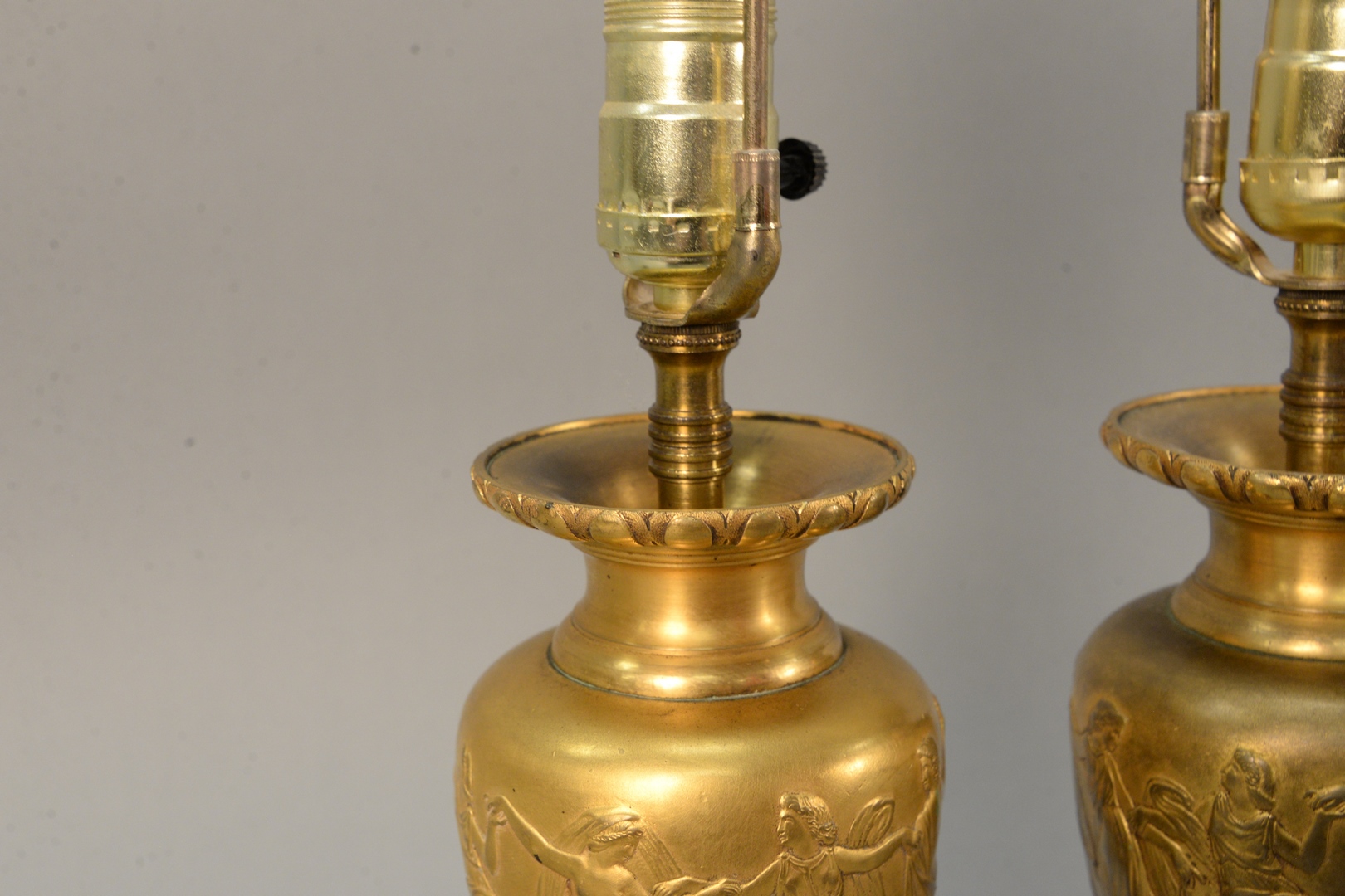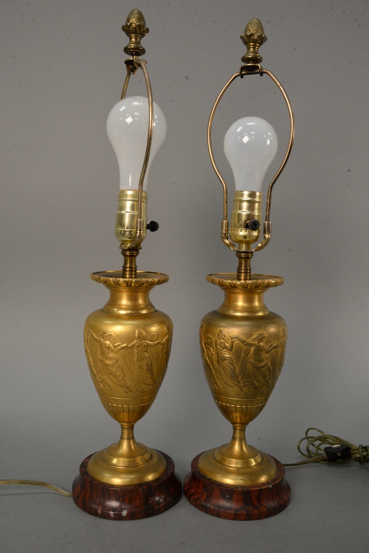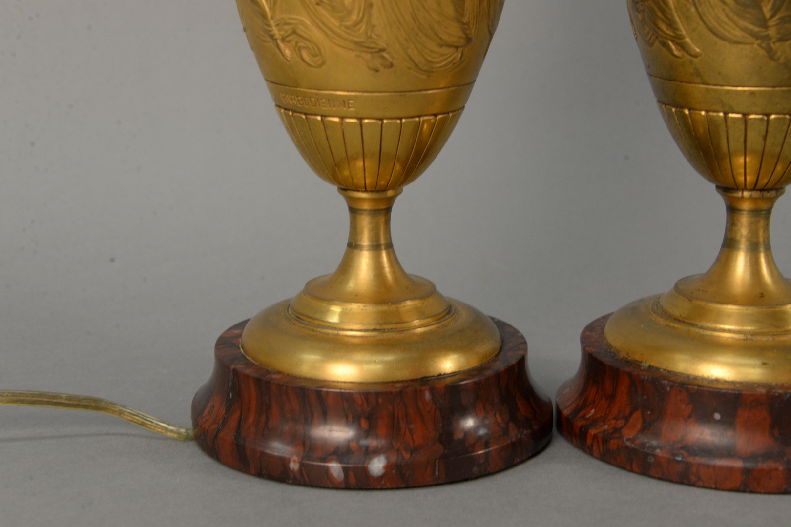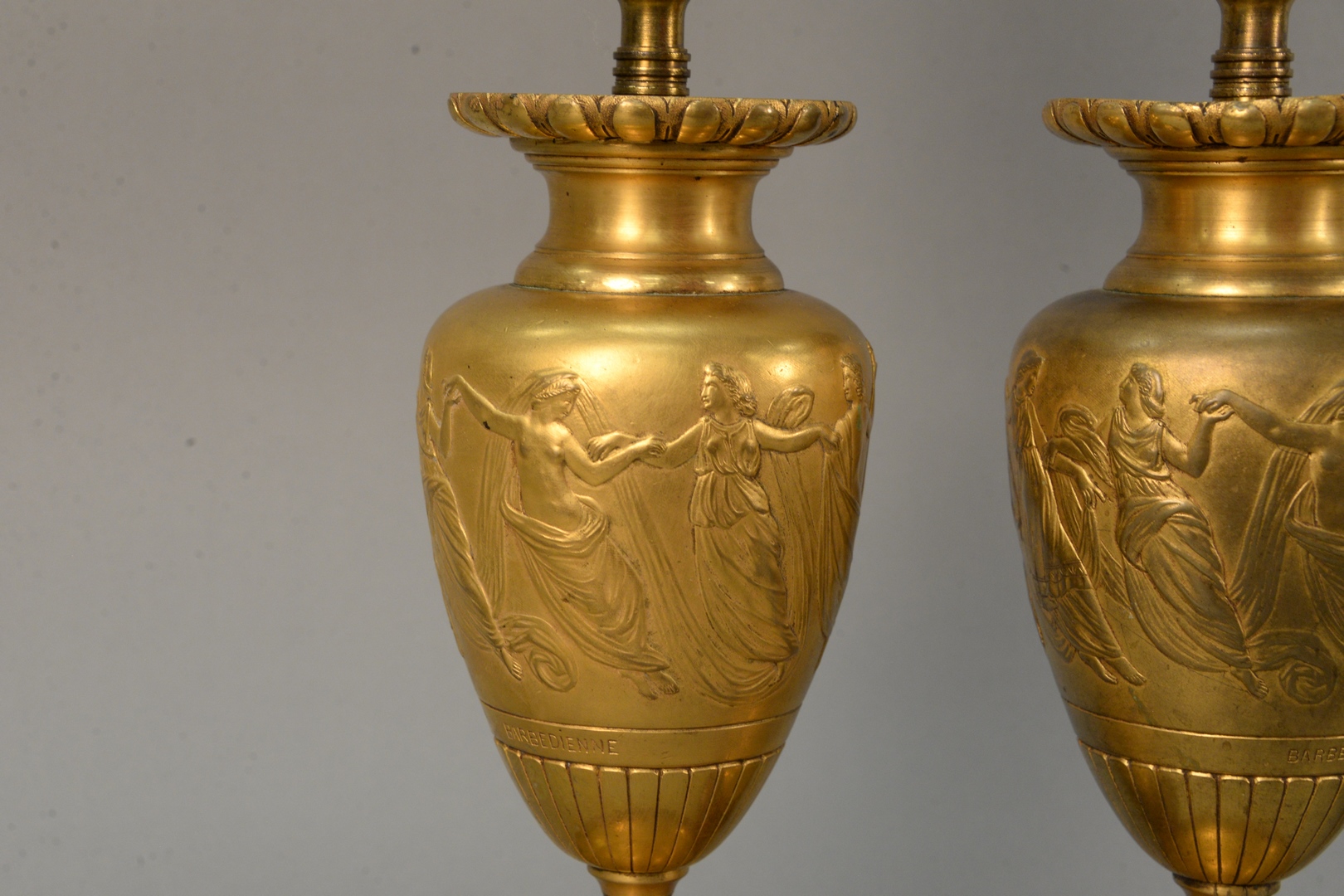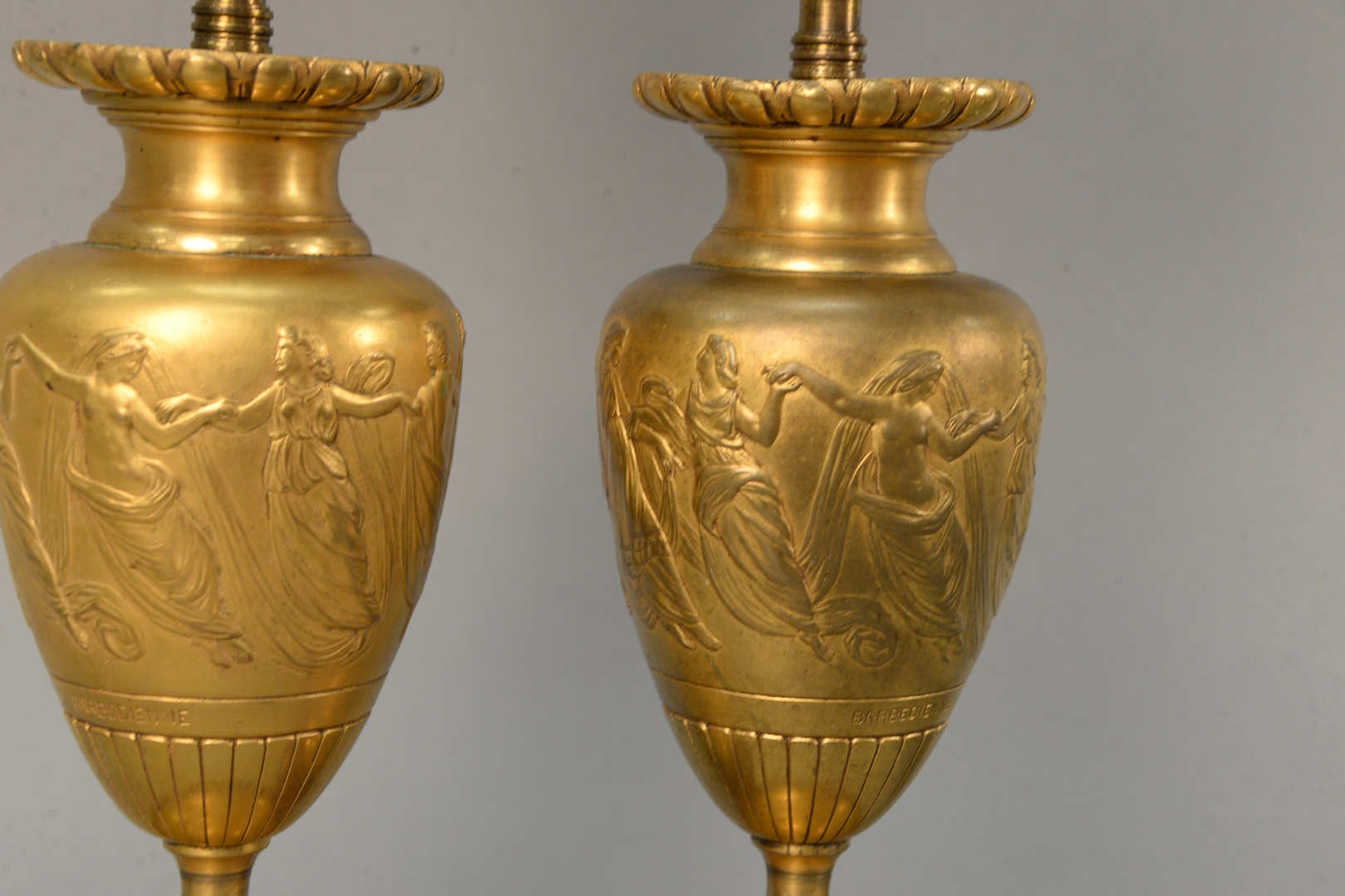 Pair of Barbedienne Bronze Urns both having flared rim, set classical figures dancing, marked Barbedienne set on rouge marble base, made into a table lamp vase height 9 inches, total height 22 inches Provenance: The Estate of Alina Roisen, Park Avenue, New York