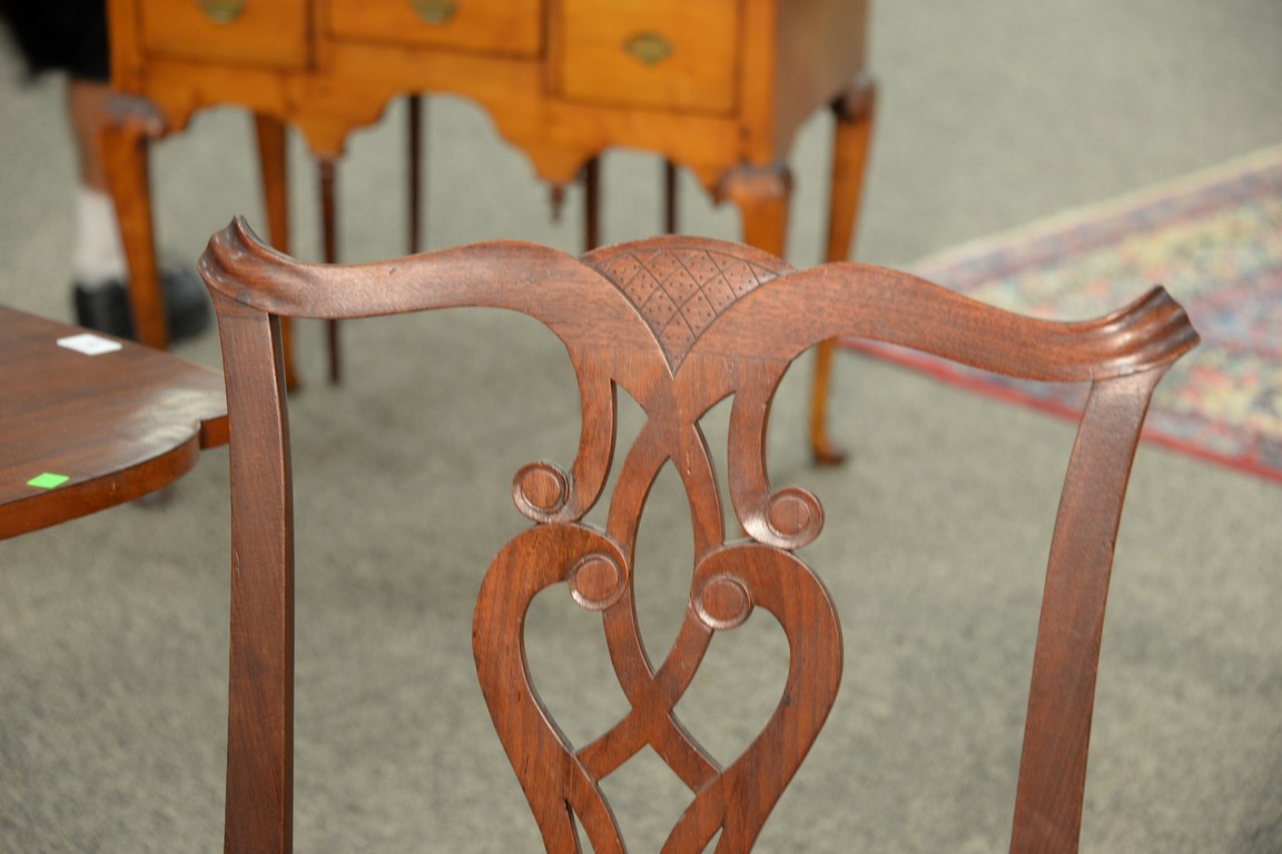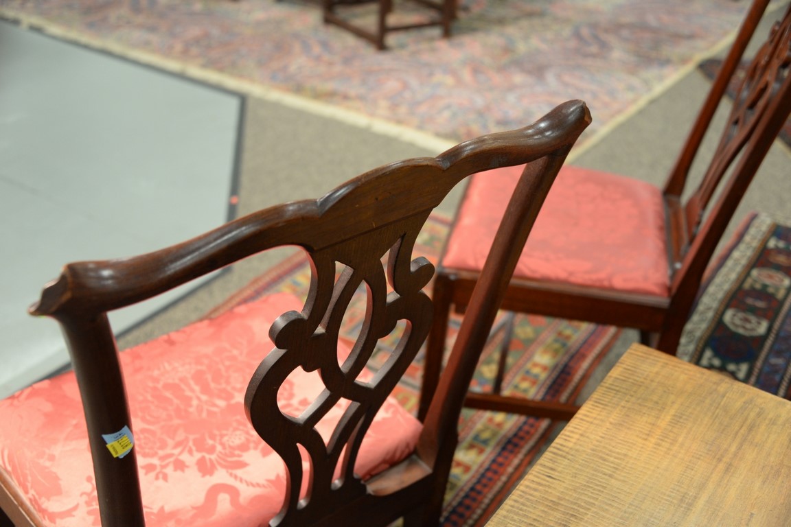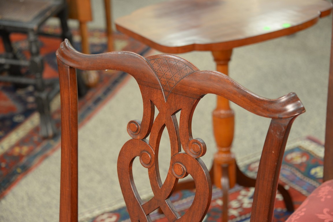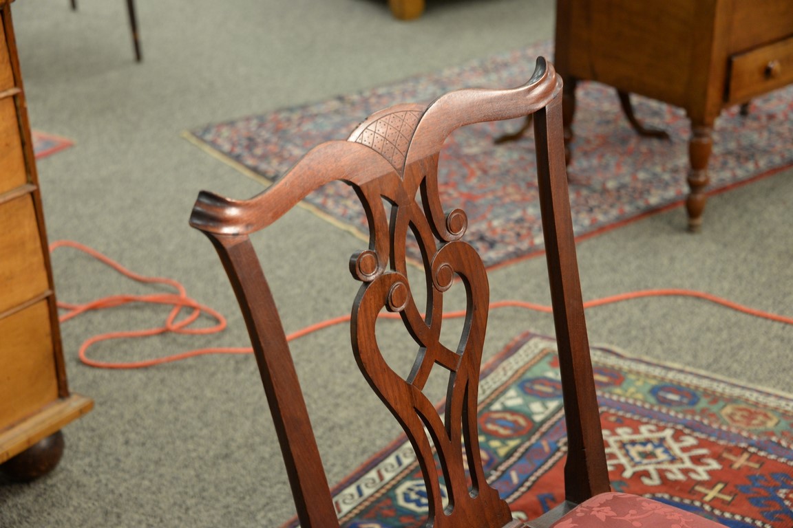 Lot 353: Set of three mahogany Chippendale side chairs having carved and cross thatched crest rail over open carved splat with slip seats all…