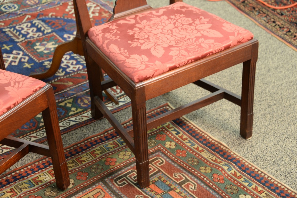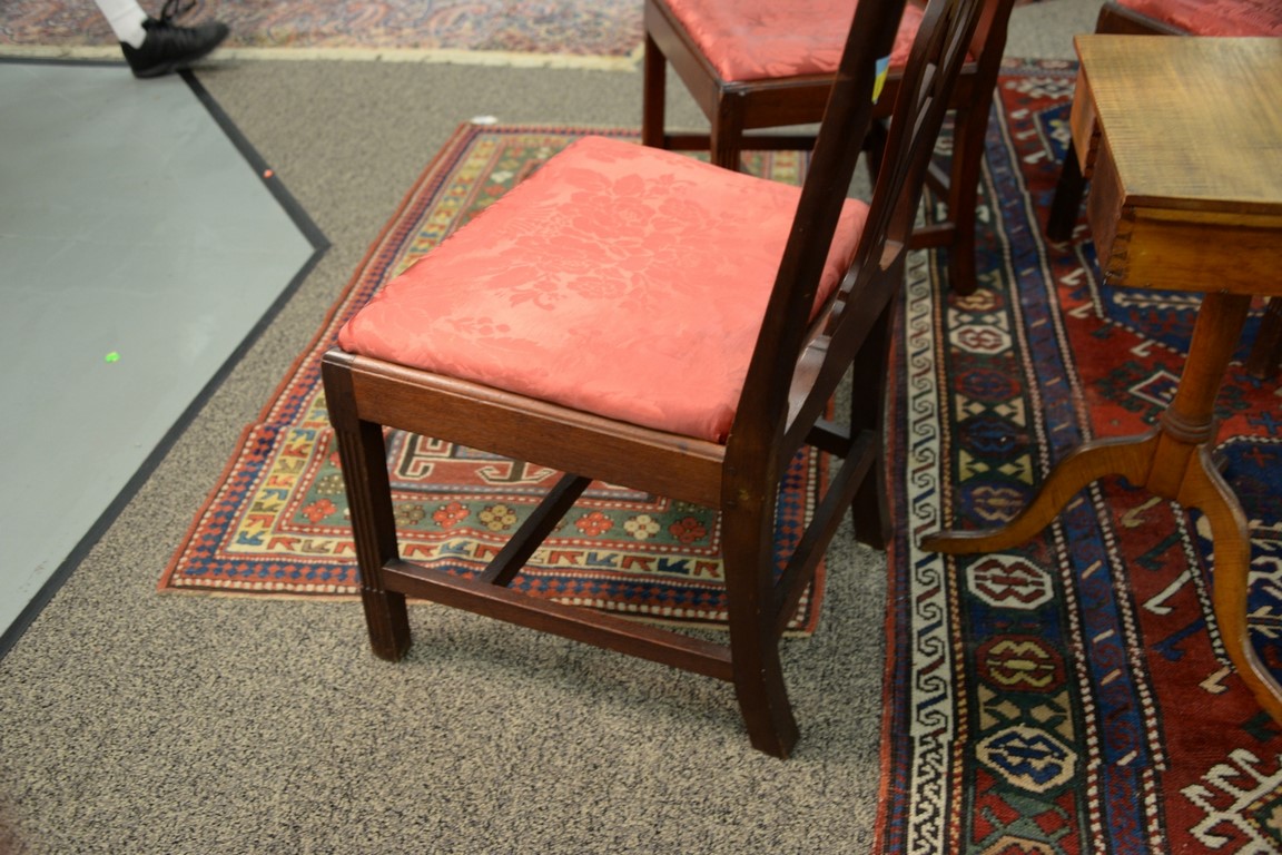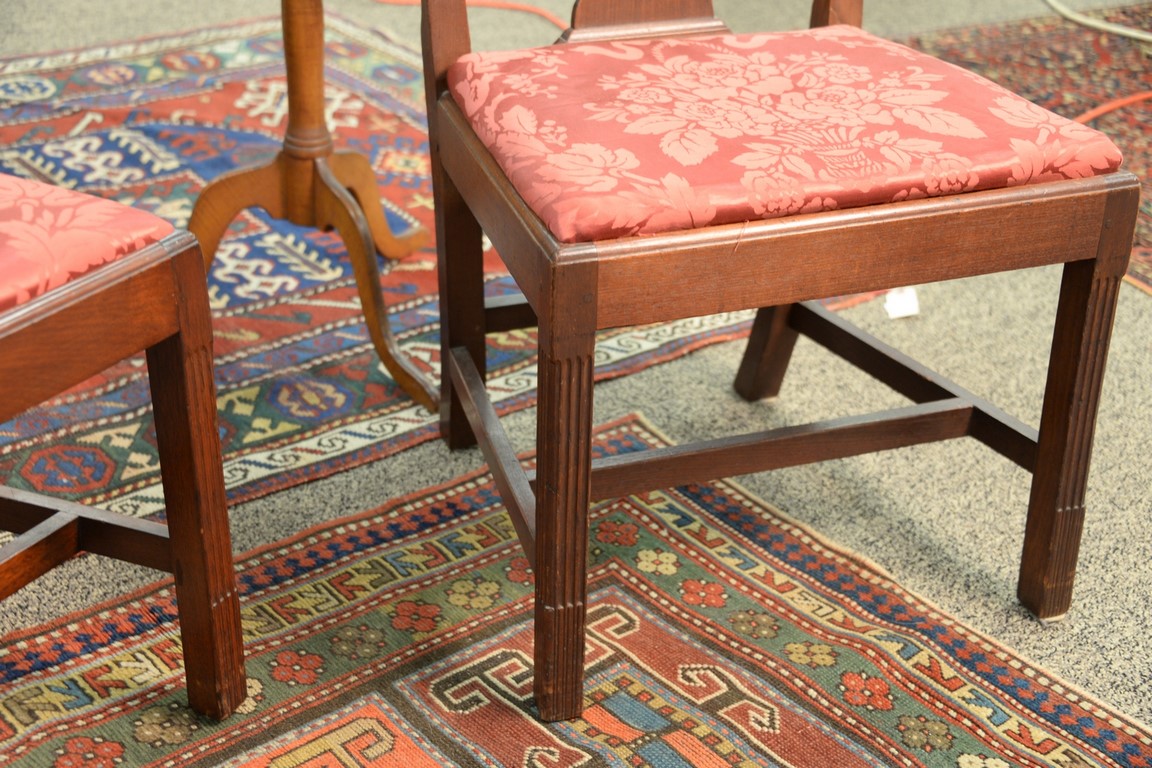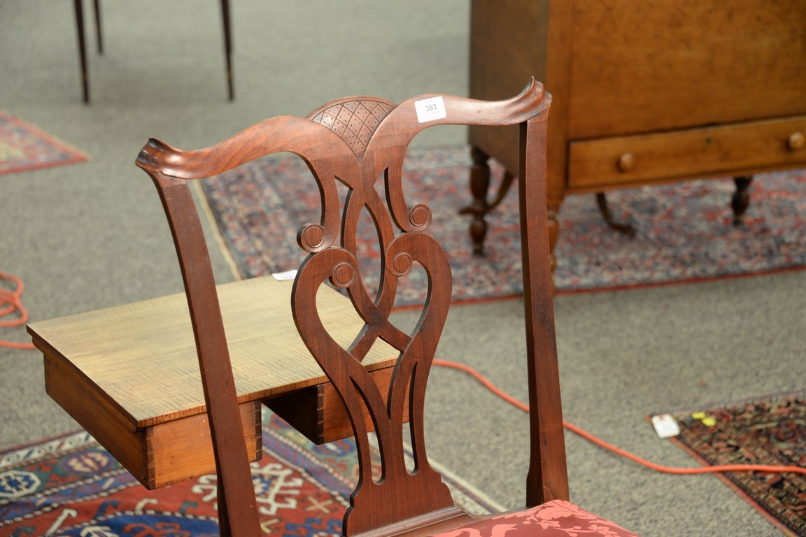Lot 353: Set of three mahogany Chippendale side chairs having carved and cross thatched crest rail over open carved splat with slip seats all…