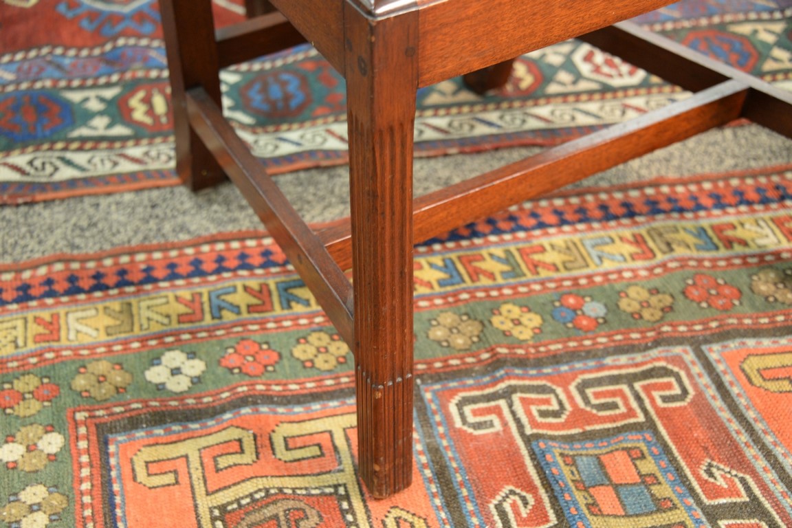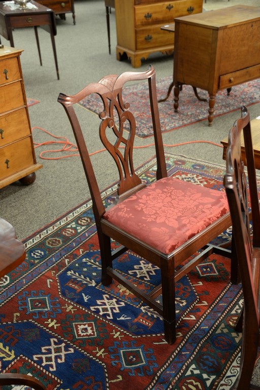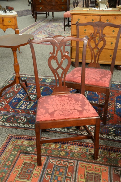 Set of three mahogany Chippendale side chairs having carved and cross thatched crest rail over open carved splat with slip seats all on stop fluted front legs joined by H stretchers, probably Newport Rhode Island, circa 1760. ht. 37 1/2in.