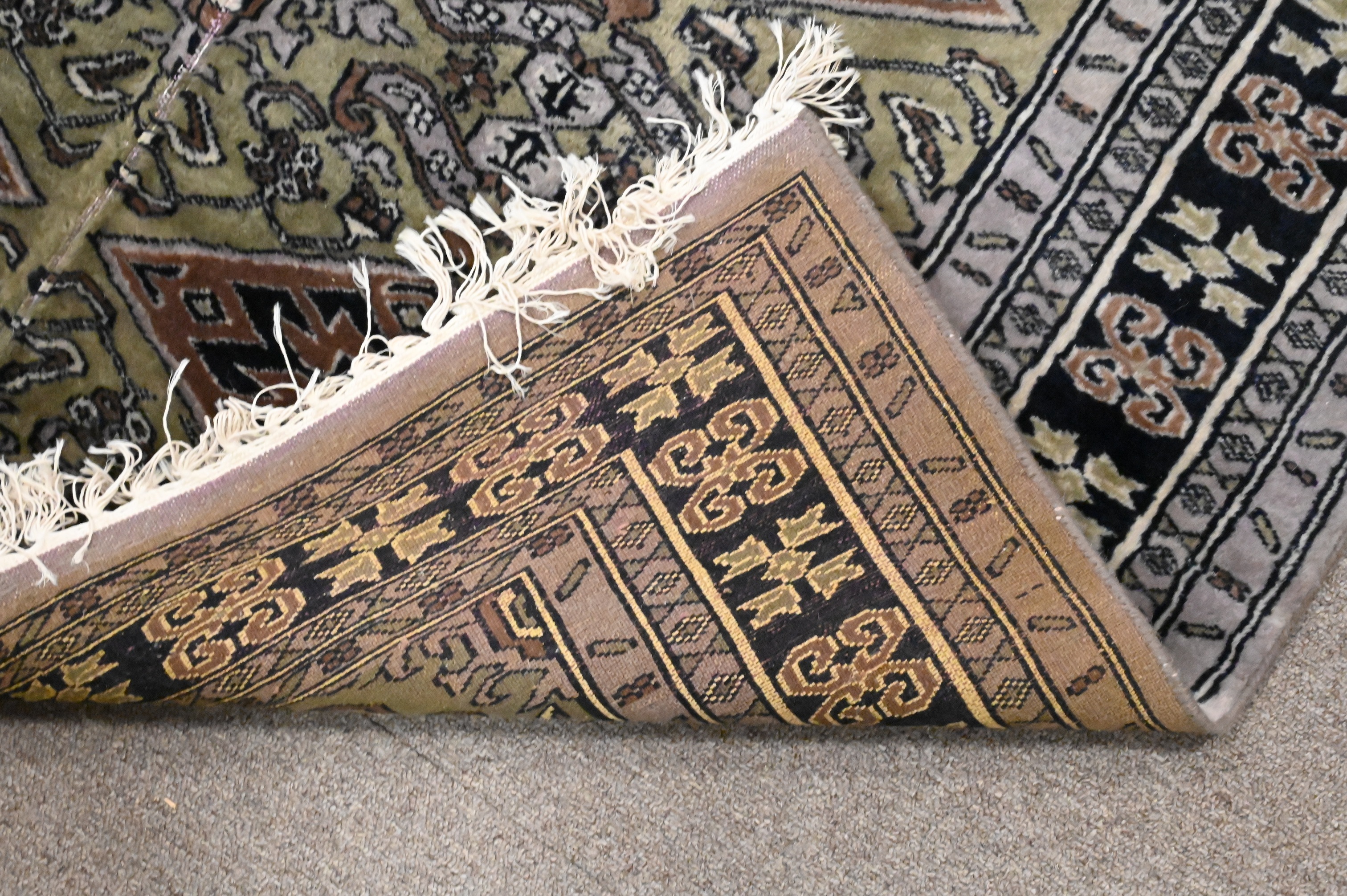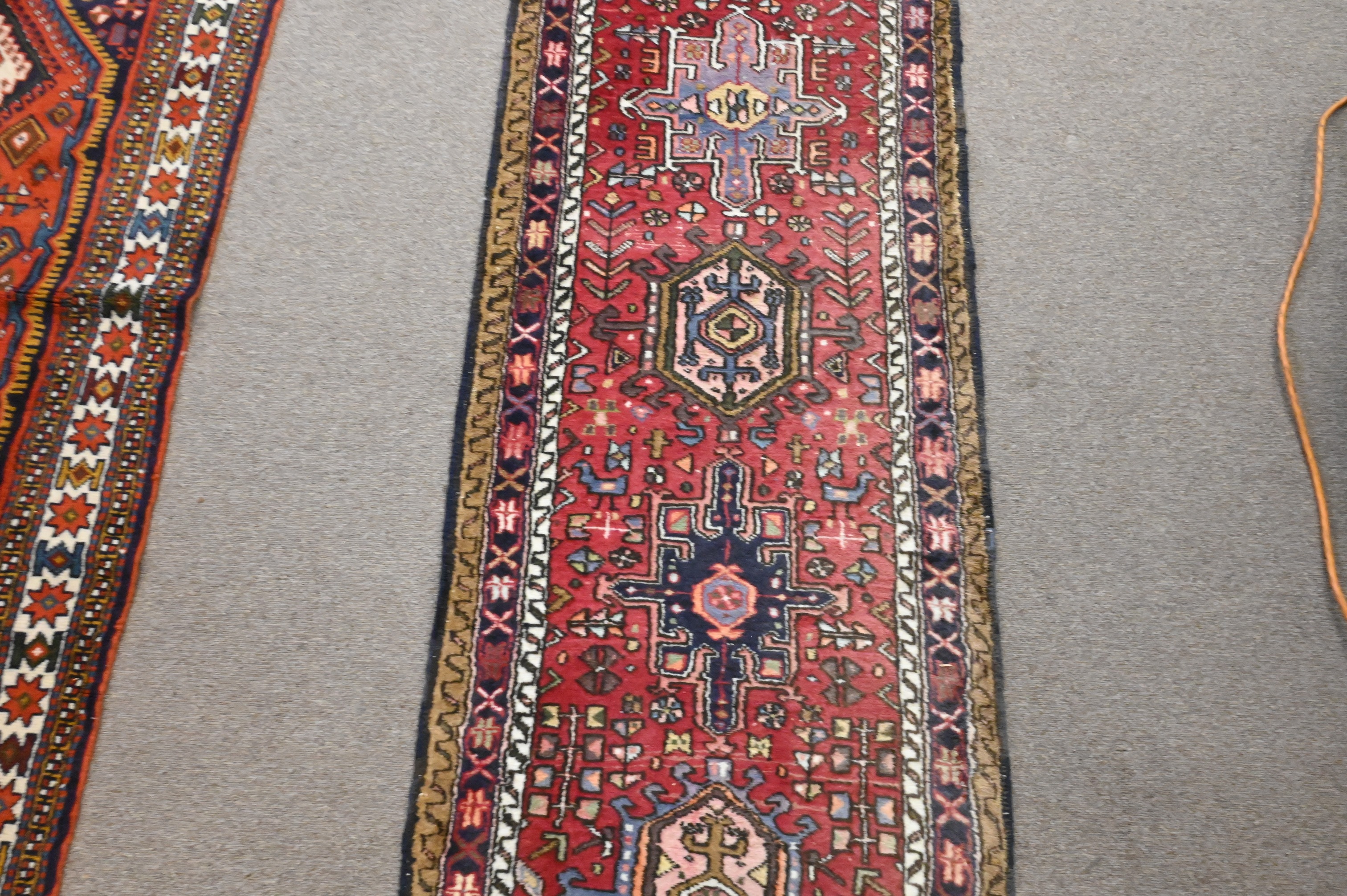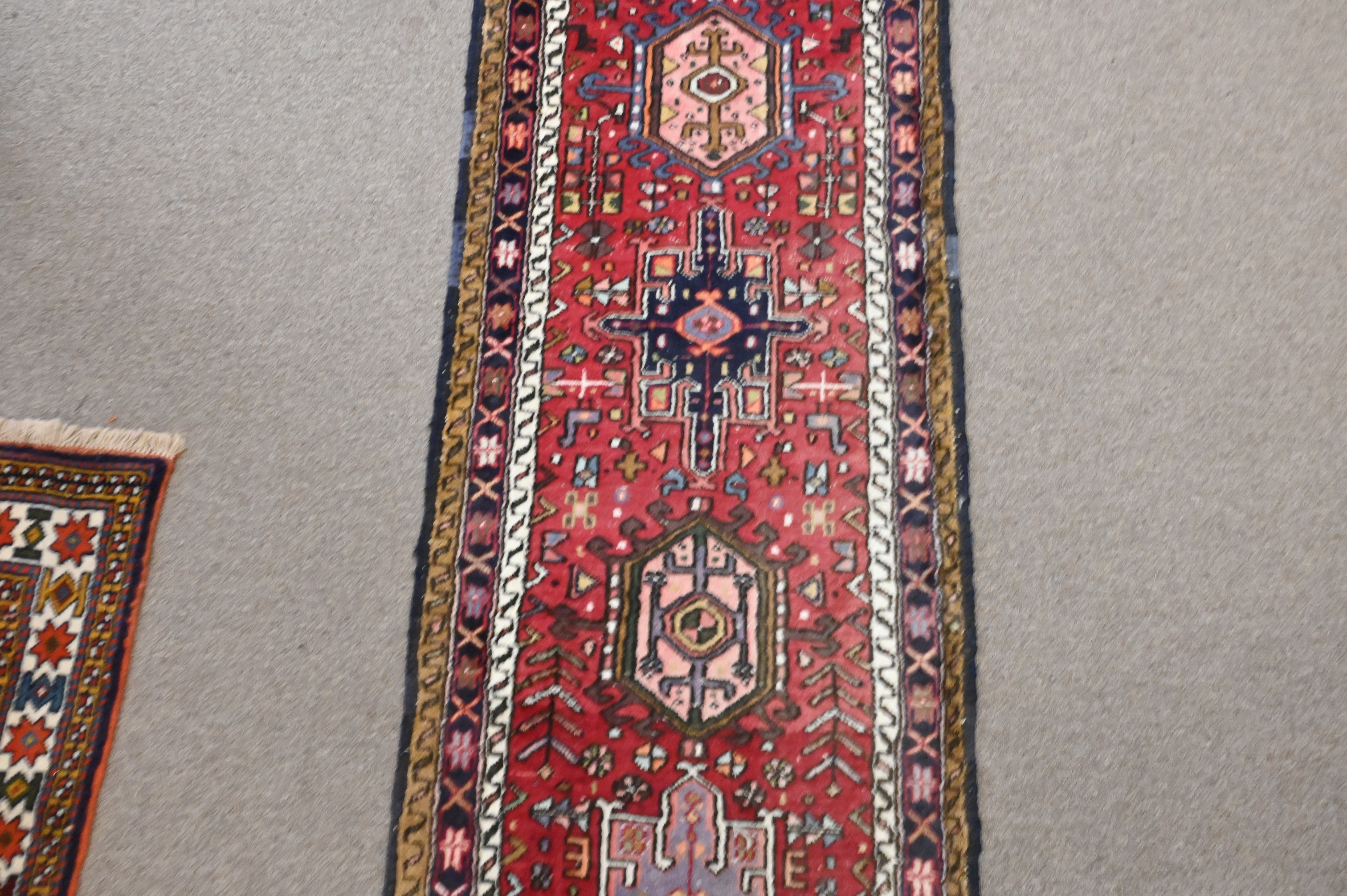 to include a runner 2′ 3″ x 15′ 10″ along with two throw rugs 4′ 2″ x 7′ and 4′ x 5′ 6″