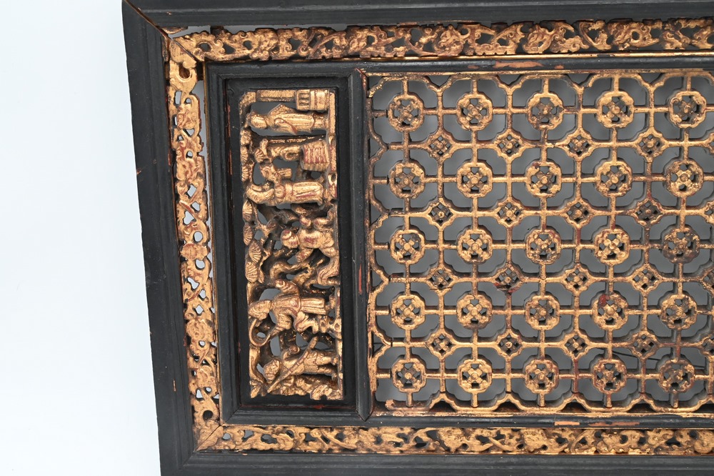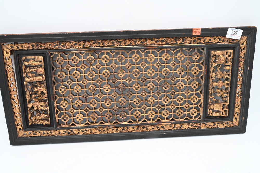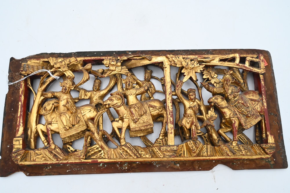 Lot 353: Two Chinese Carved Panels, to include one having gilt with carved figures on horseback, the other having gilt with geometric design, smaller panel height 8 1/8 inches, width 18 1/4 inches; larger panel height 11 1/2 inches, width 25 3/4 inches.