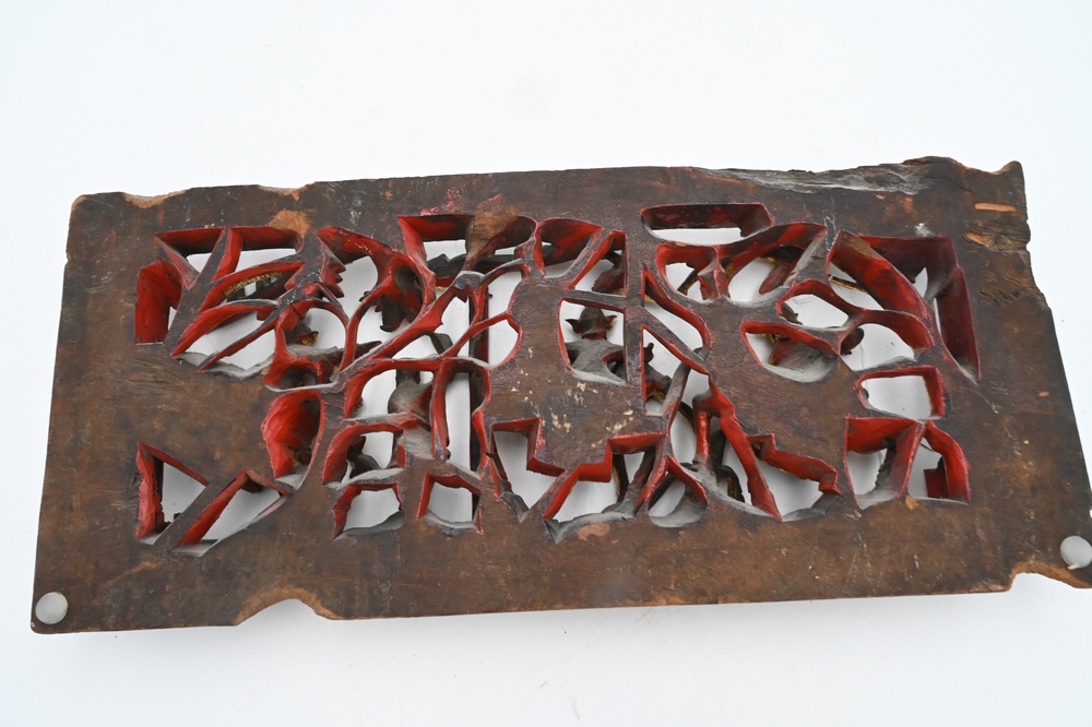 Two Chinese Carved Panels, to include one having gilt with carved figures on horseback, the other having gilt with geometric design, smaller panel height 8 1/8 inches, width 18 1/4 inches; larger panel height 11 1/2 inches, width 25 3/4 inches.