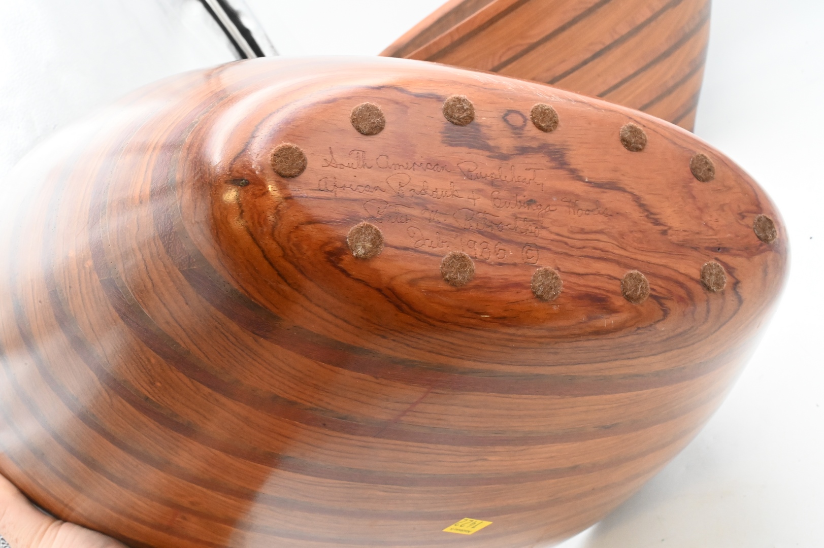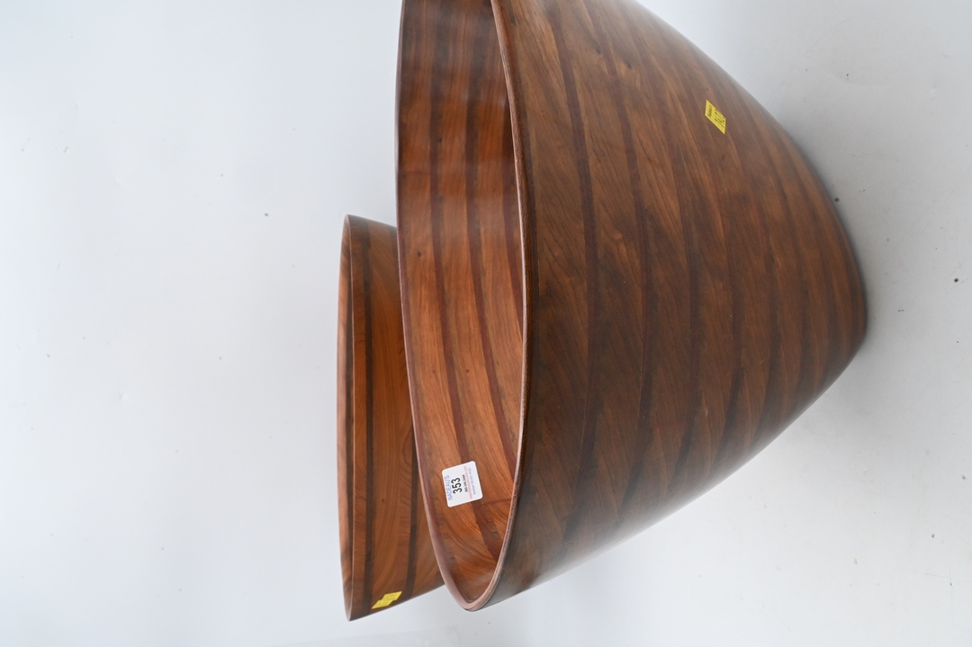 Two Large Peter Petrochko Inlaid Bowls, both signed on bottom, African Bubinga, Wenge, Padouk, Purple Hearts, Afromasia Woods, 1986, tallest 12 1/2 inches, top 13″ x 18″.