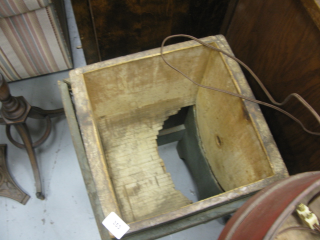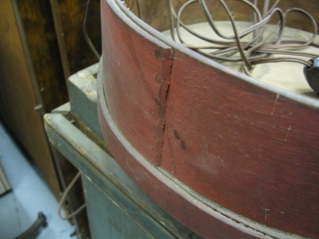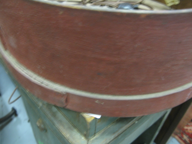 Two primitive pieces, a round wooden measure in red paint and a butter churn in green paint, as is.