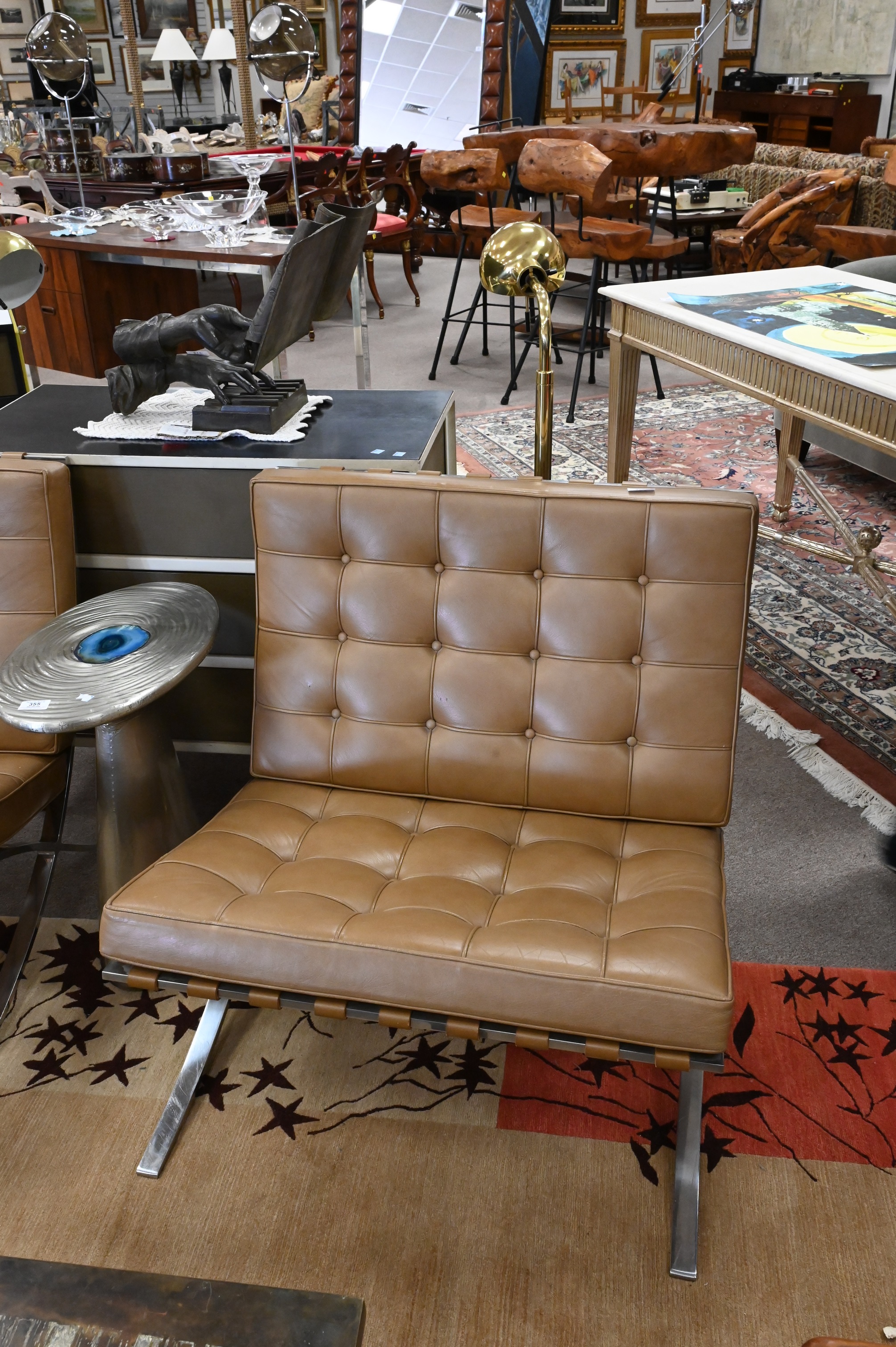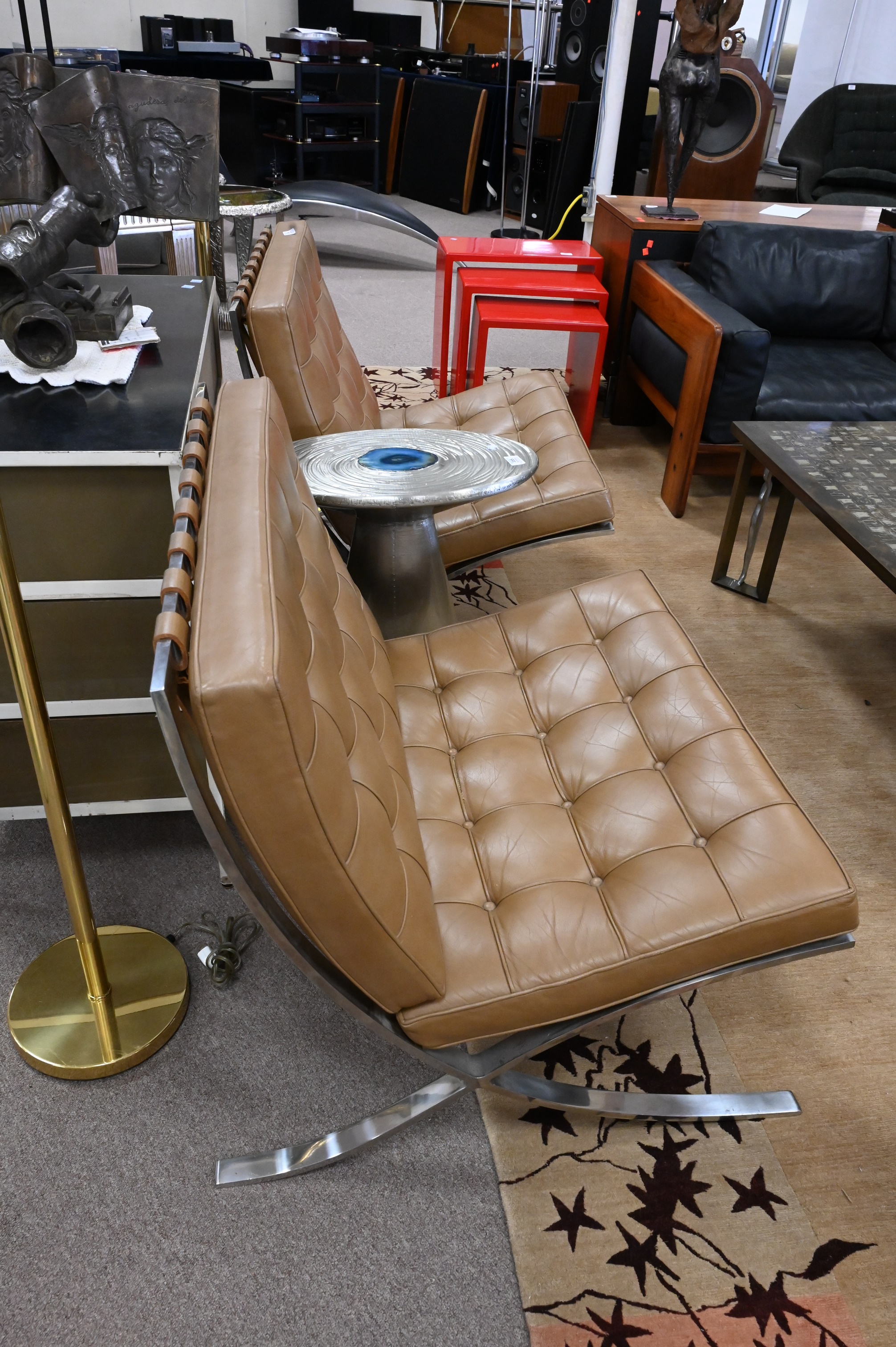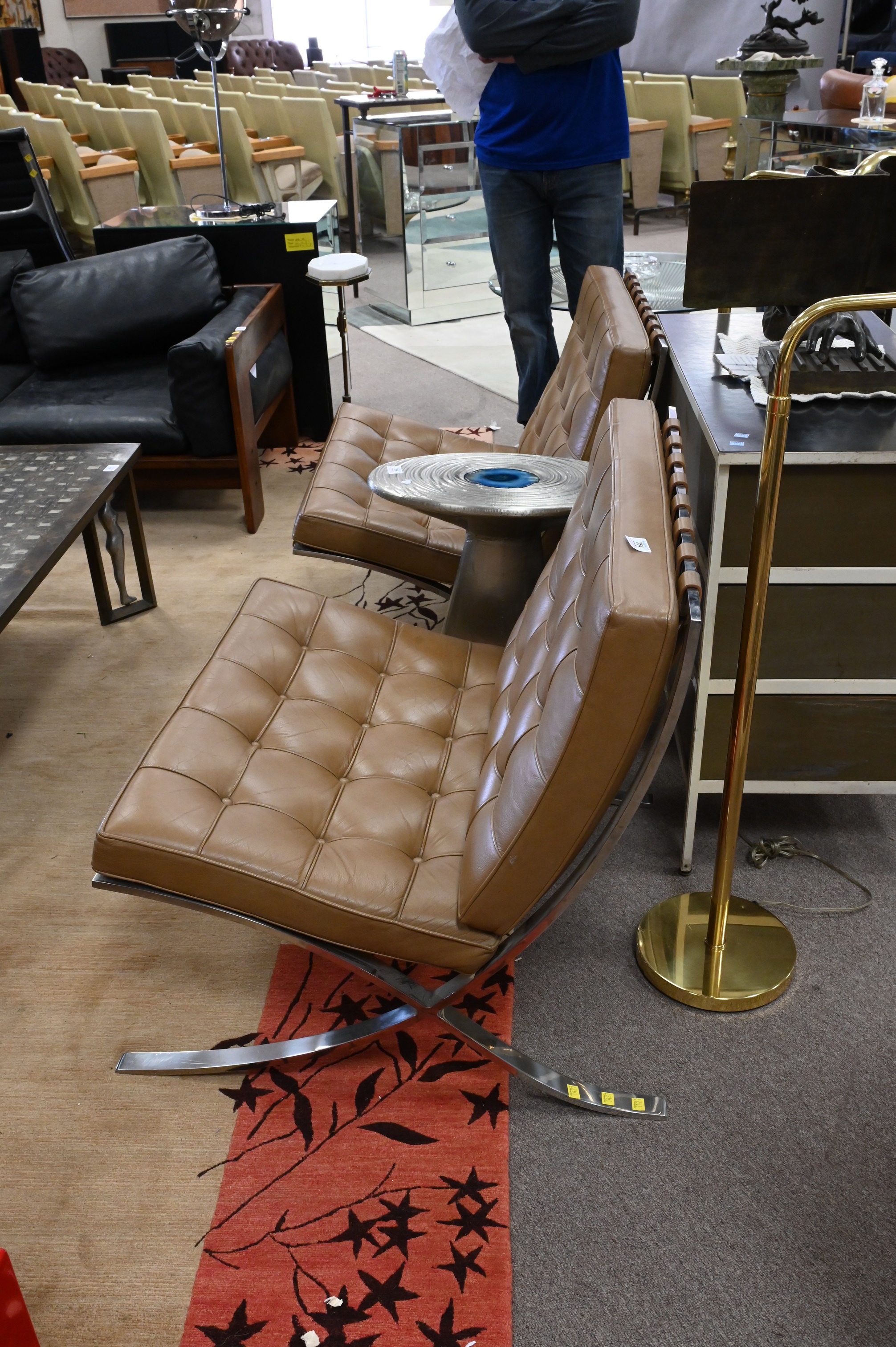 A Pair of Mies Van Der Rohe Barcelona Leather Lounge Chairs, height 30 inches, width 29 1/2 inches.