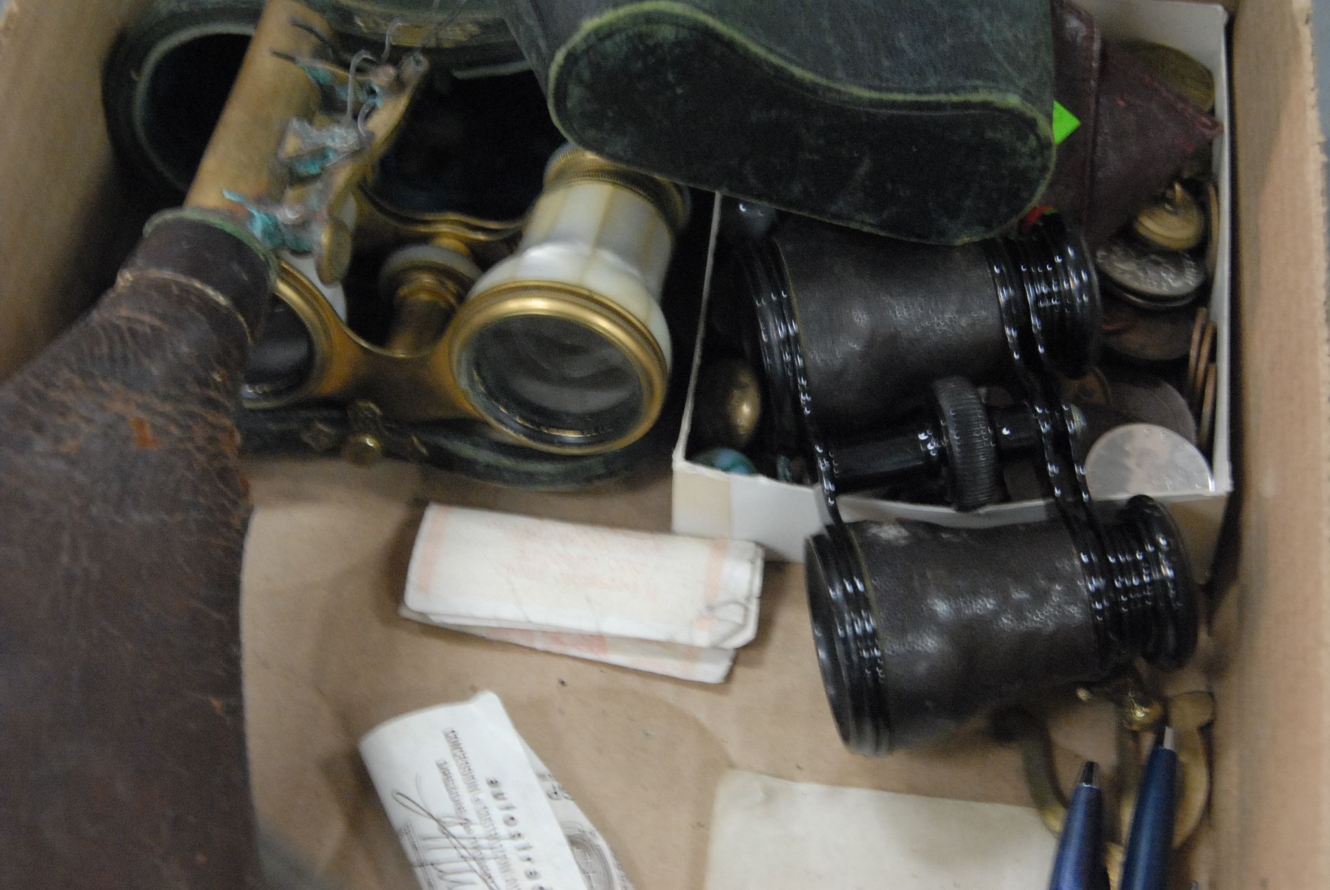 Lot 354: Box lot with leather powder horn, two opera glasses, and various coins mostly pennies and foreign coins.