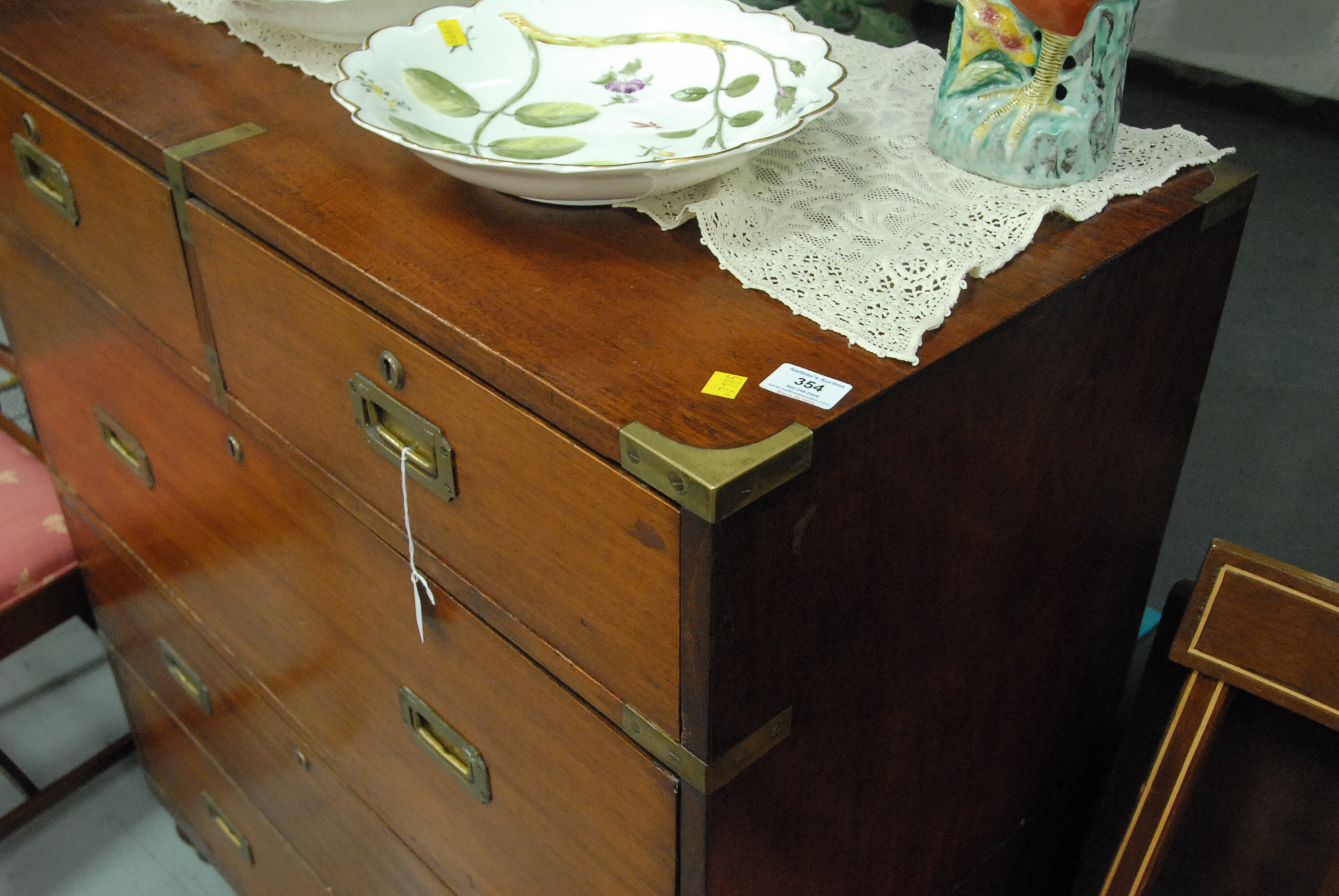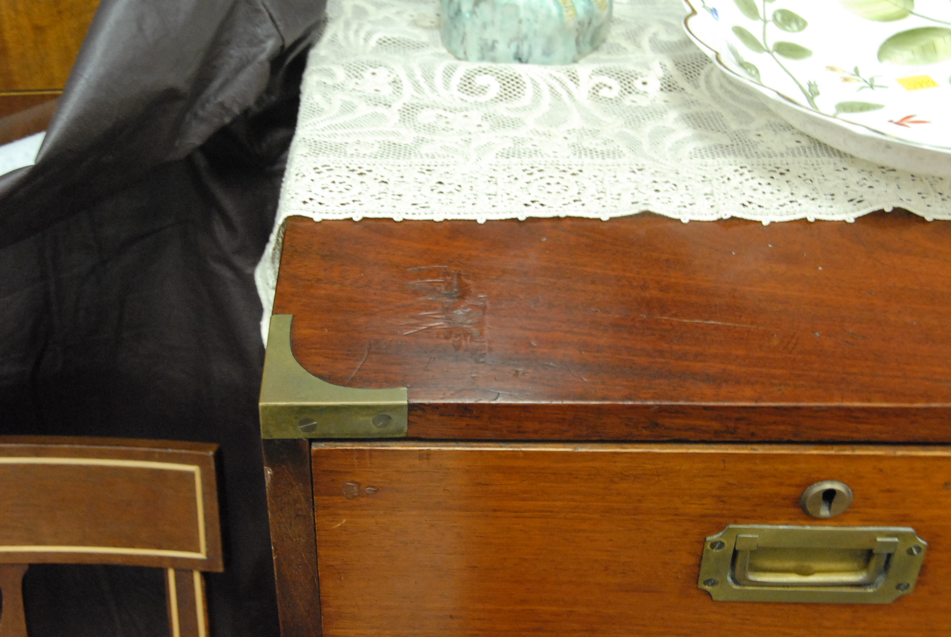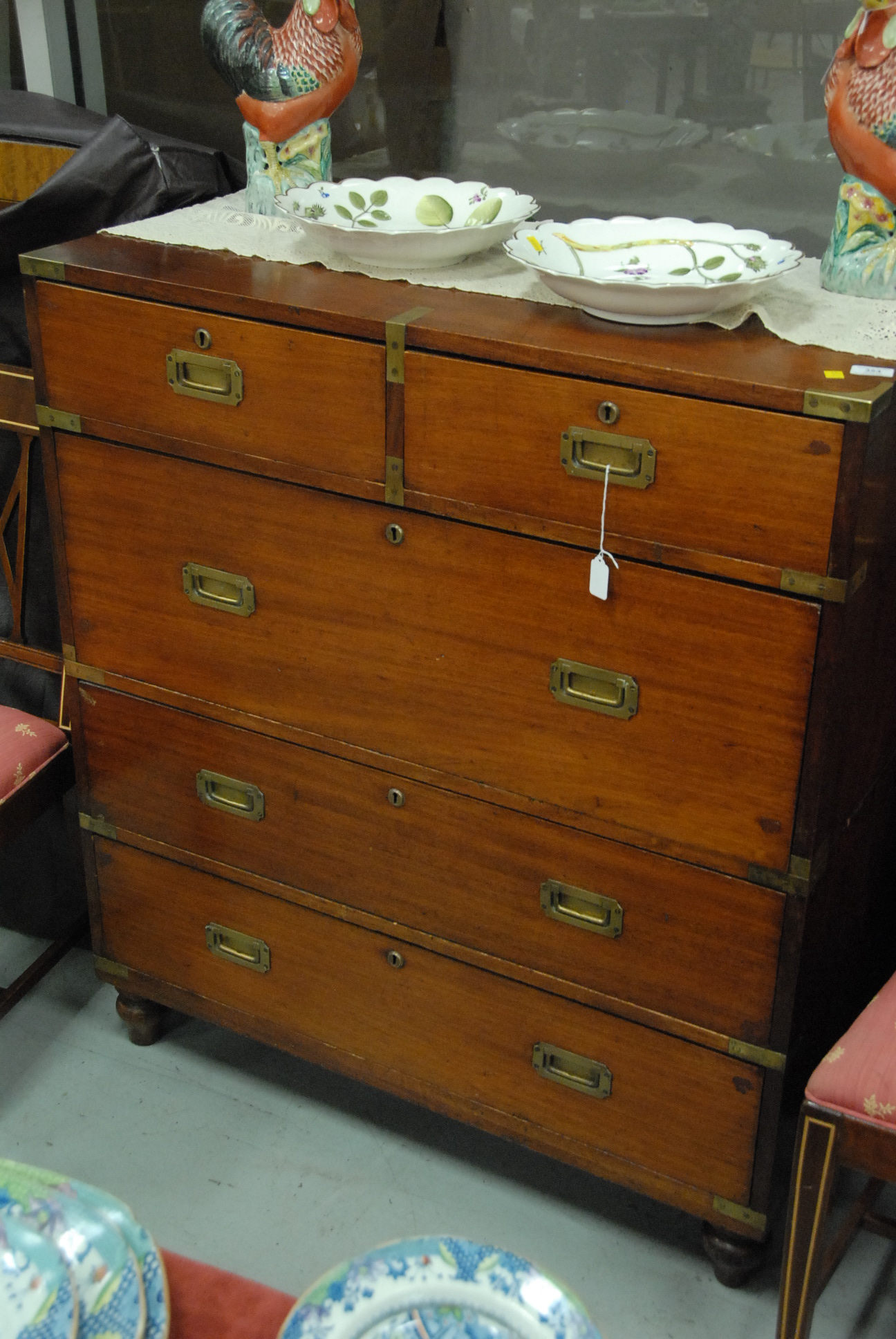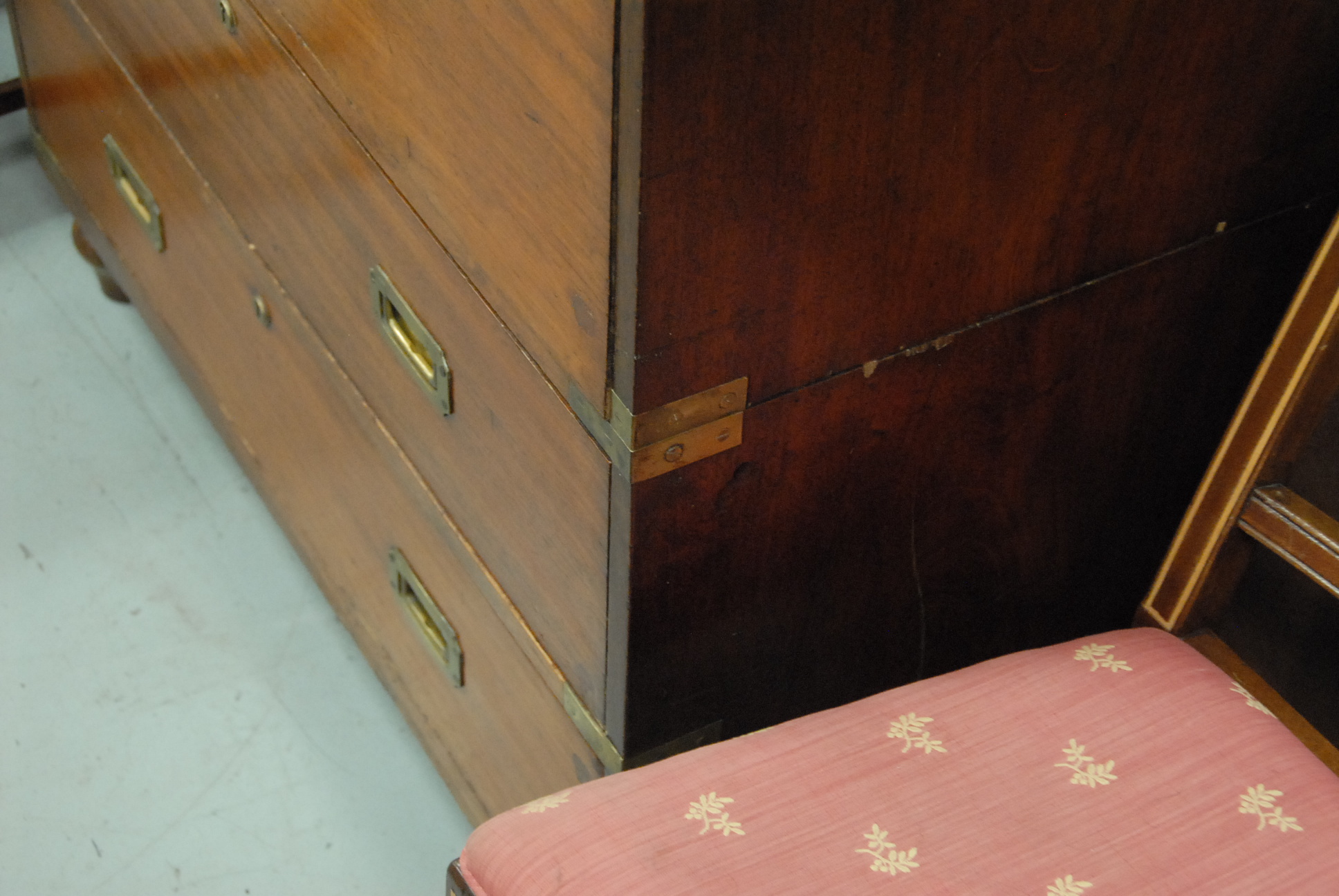 Lot 354: Campaign chest in two parts, upper section with two drawers over lower section with two long drawers all set on turnip feet with brass mounts and brass pulls.