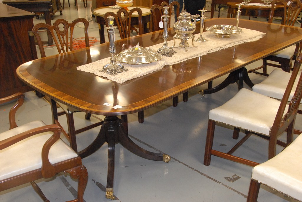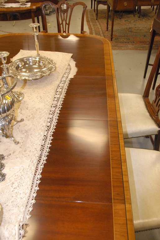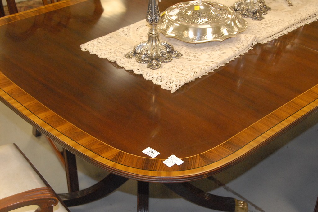 Lot 354: Custom mahogany dining table having rectangular top with double banded inlay all on double pedestal base, Wakefield collection by St…