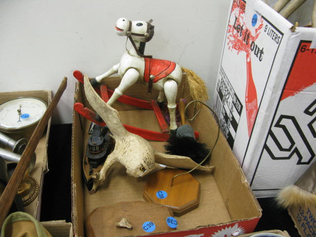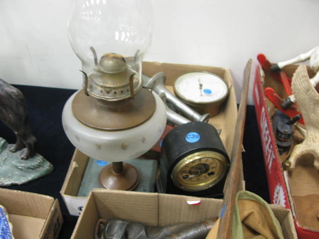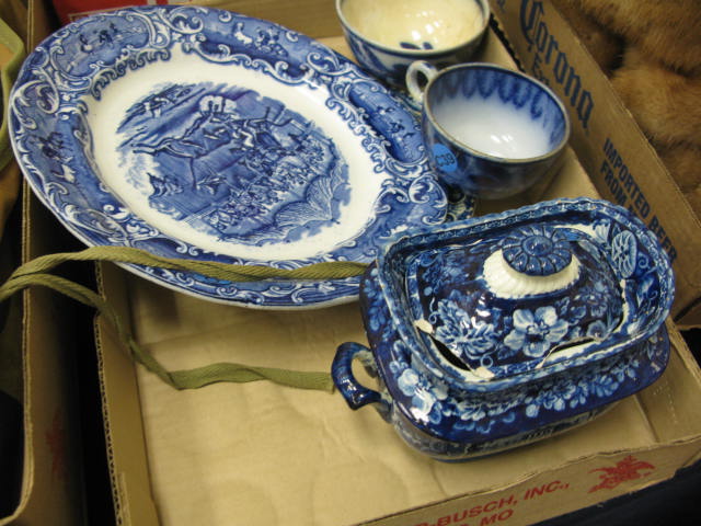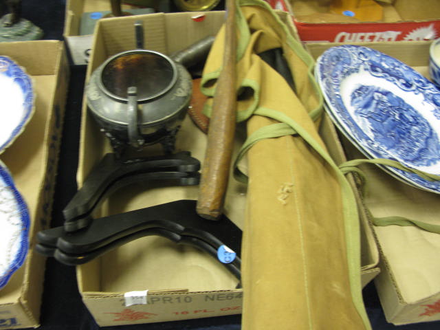 Four box lots to include blue and white porcelain along with pewter candlesticks, plate, oil lamp, iron chisel, silver plated items, etc