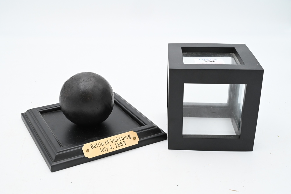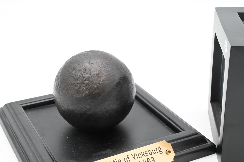 Lot 354: Group Lot, to include a cannon ball, case marked Battle of Vicksburg, July 4, 1863; eight fired 58 caliber bullets, written on back “Found in Fort of Trenches on North Side of North Anna River, VA”; along with four antique powder horns, Provenance: Estate of Bruce Sasalla, East Hartford, Connecticut.