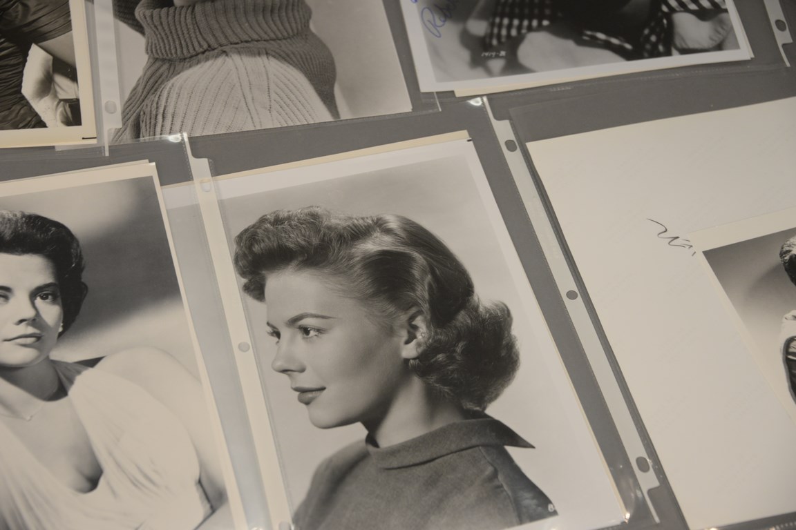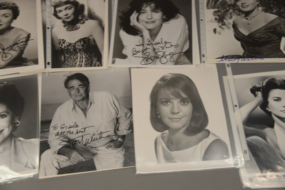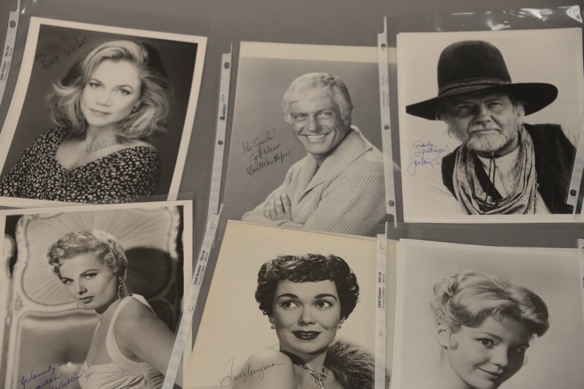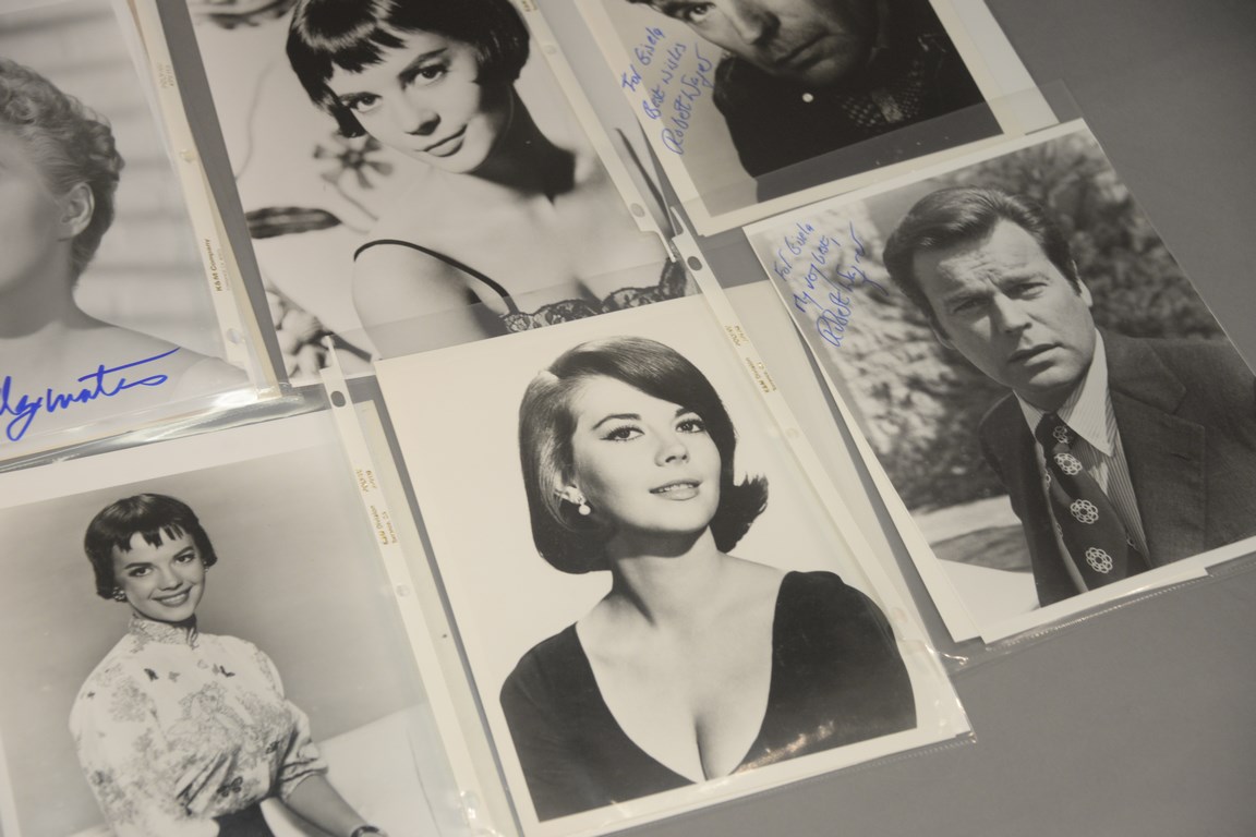 Group of 36 photographs, 25 are autographed photographs to include 3 Kathleen Turner, 1 Constance Towers, 1 Dick Van Dyke, 1 Mamie Van Doran, 1 John Voight, 1 Dennis Weaver, 1 Martha Hyer Wallis, 3 Jane Wyman, 1 Debra Winger, 3 Shelly Winters, 1 Jessica Walters, 2 Stuart Whitman, 6 Robert Wagner, and 11 unsigned photographs including 1 Tuesday Weld, 9 Natalie Wood, and 1 Carmel Wilde.