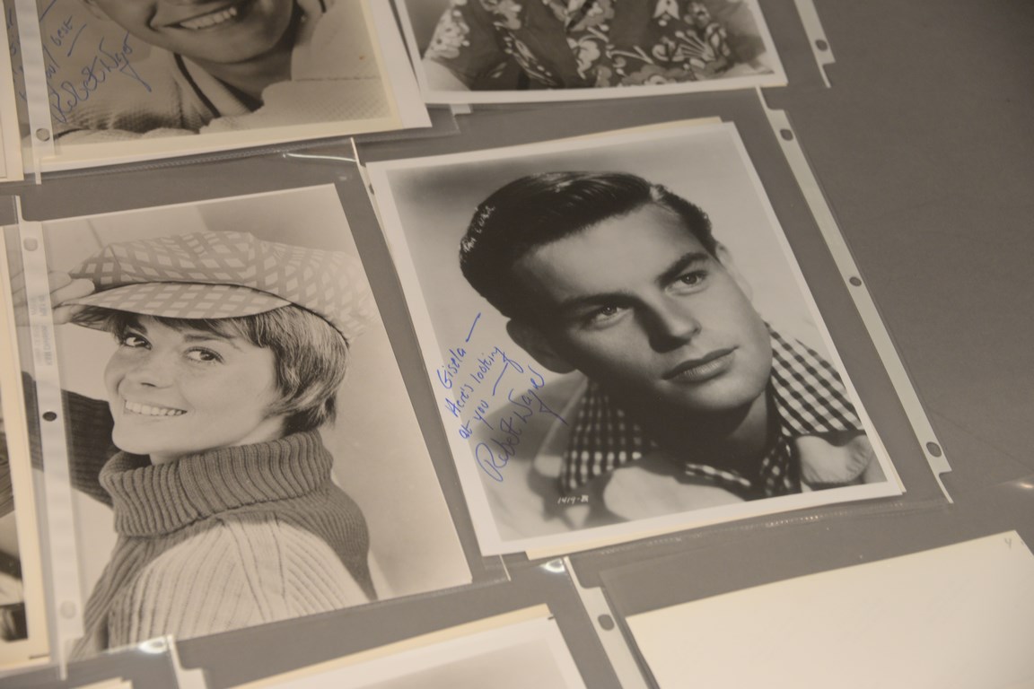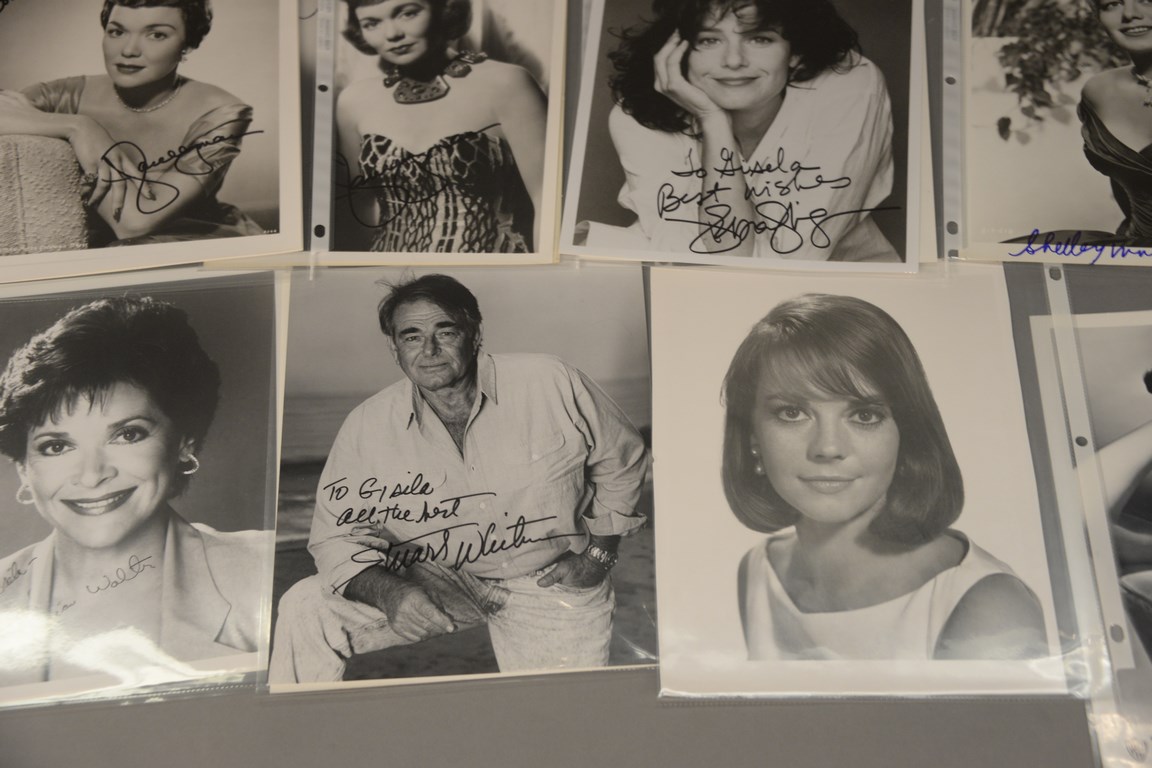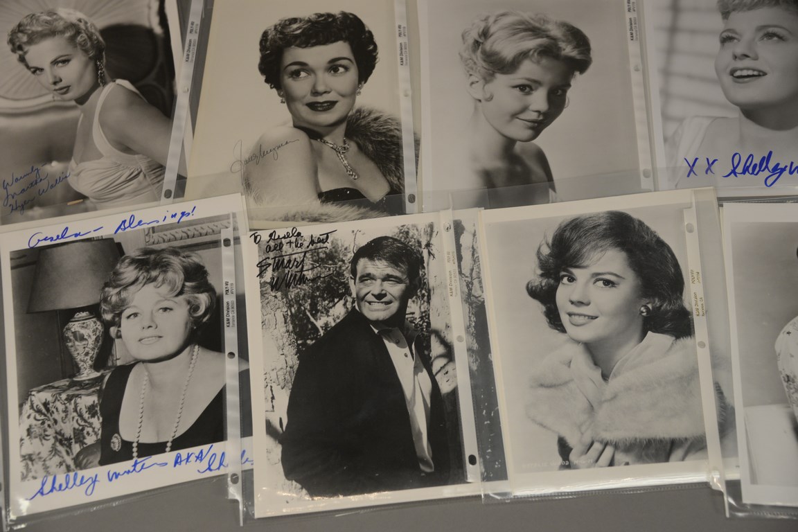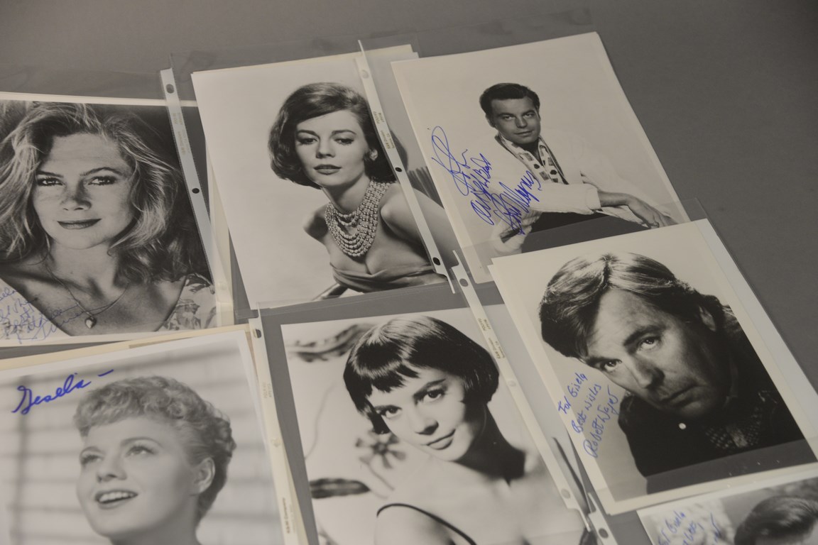 Group of 36 photographs, 25 are autographed photographs to include 3 Kathleen Turner, 1 Constance Towers, 1 Dick Van Dyke, 1 Mamie Van Doran, 1 John Voight, 1 Dennis Weaver, 1 Martha Hyer Wallis, 3 Jane Wyman, 1 Debra Winger, 3 Shelly Winters, 1 Jessica Walters, 2 Stuart Whitman, 6 Robert Wagner, and 11 unsigned photographs including 1 Tuesday Weld, 9 Natalie Wood, and 1 Carmel Wilde.