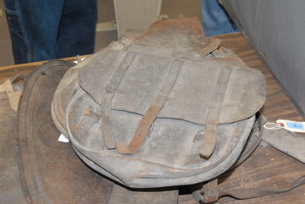 Group of four early US saddle bags and leather straps.