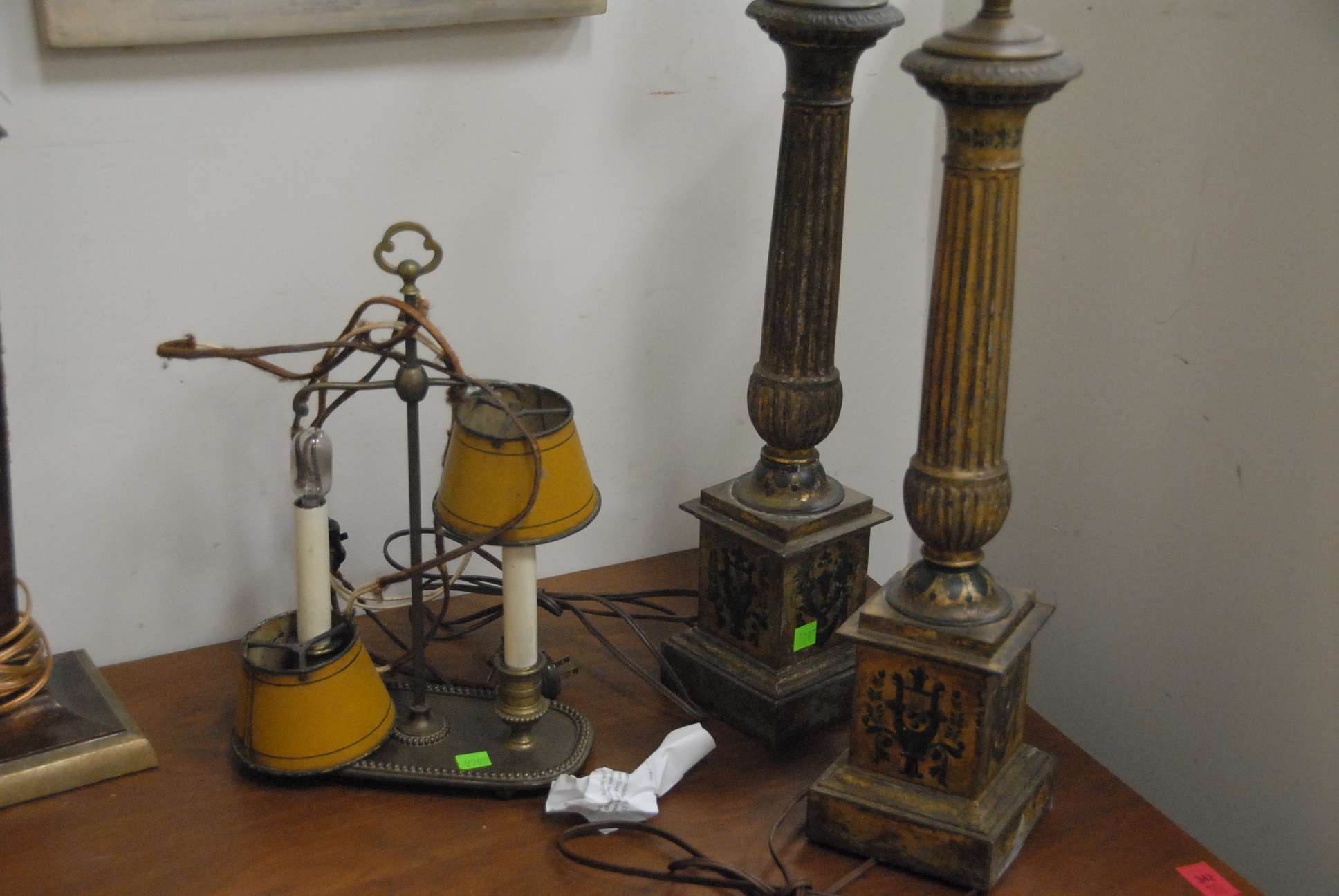 Lot 354: Group of six table lamps including pair of tole column table lamps, metal urn table lamp, Staffordshire, and desk lamp.