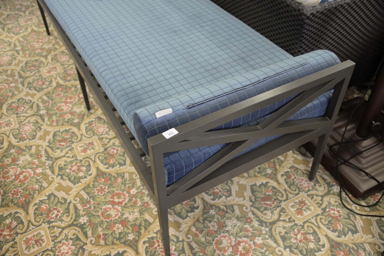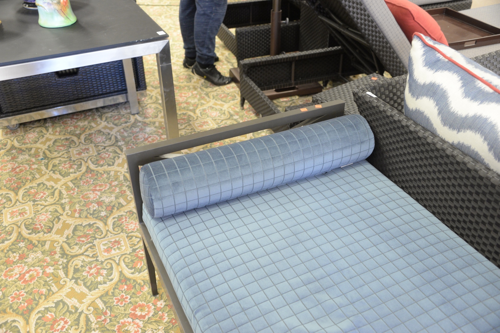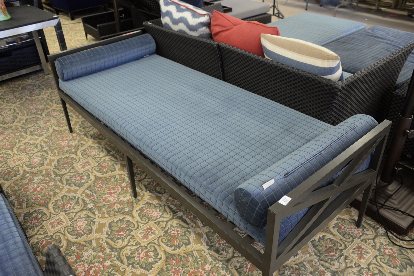 Lot 354: JANUS et Cie Bench/Daybed, having custom cushion and bolsters, along with custom outdoor covers, total height 25 inches, width 30 inches, length 80 inches. Provenance: David and Cynthia Kim, 22 Stoney Wylde Lane, Greenwich, Connecticut. View home by visiting: https://www.zillow.com/homedetails/22-Stoney-Wylde-Ln-Greenwich-CT-06830/177238281_zpid/