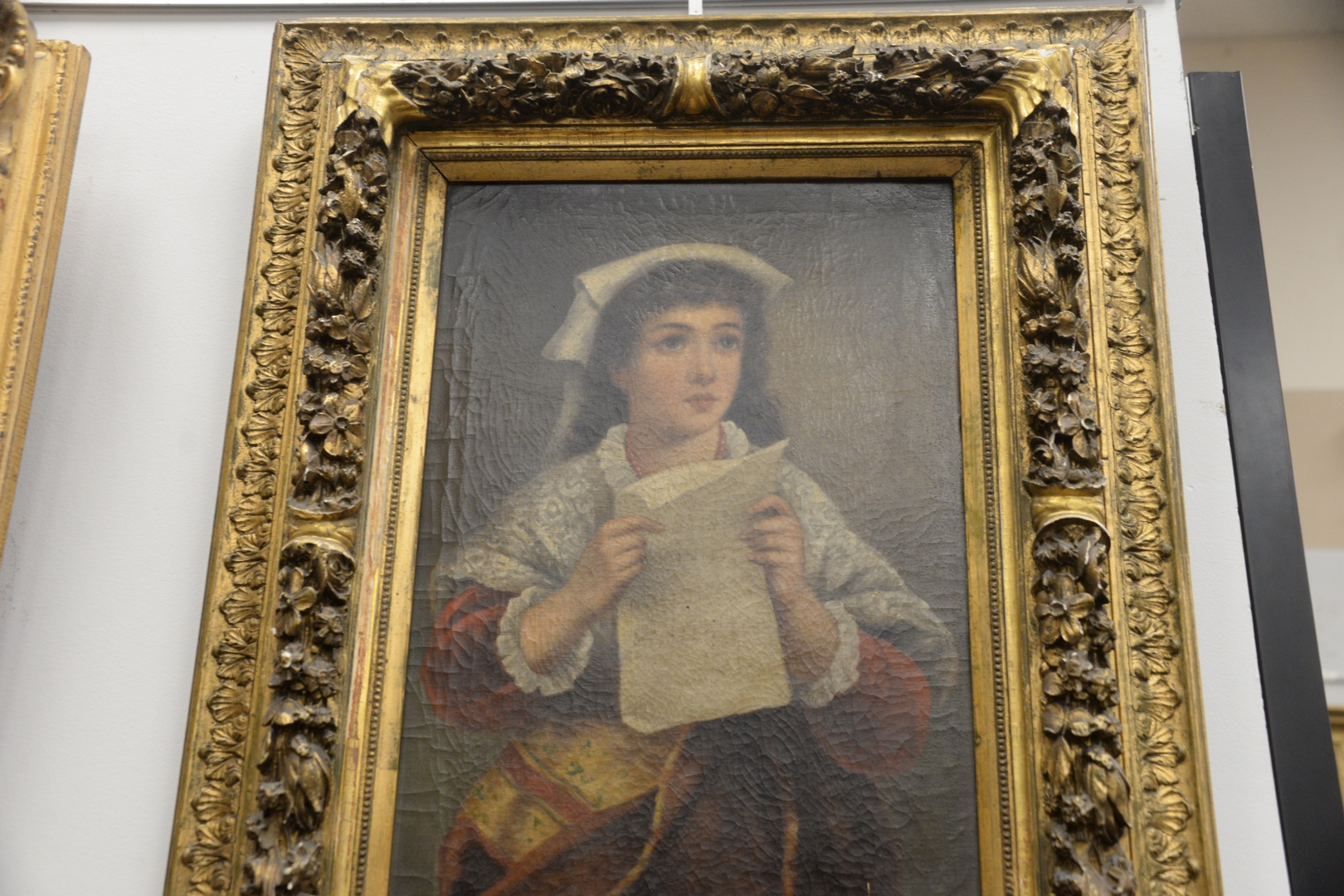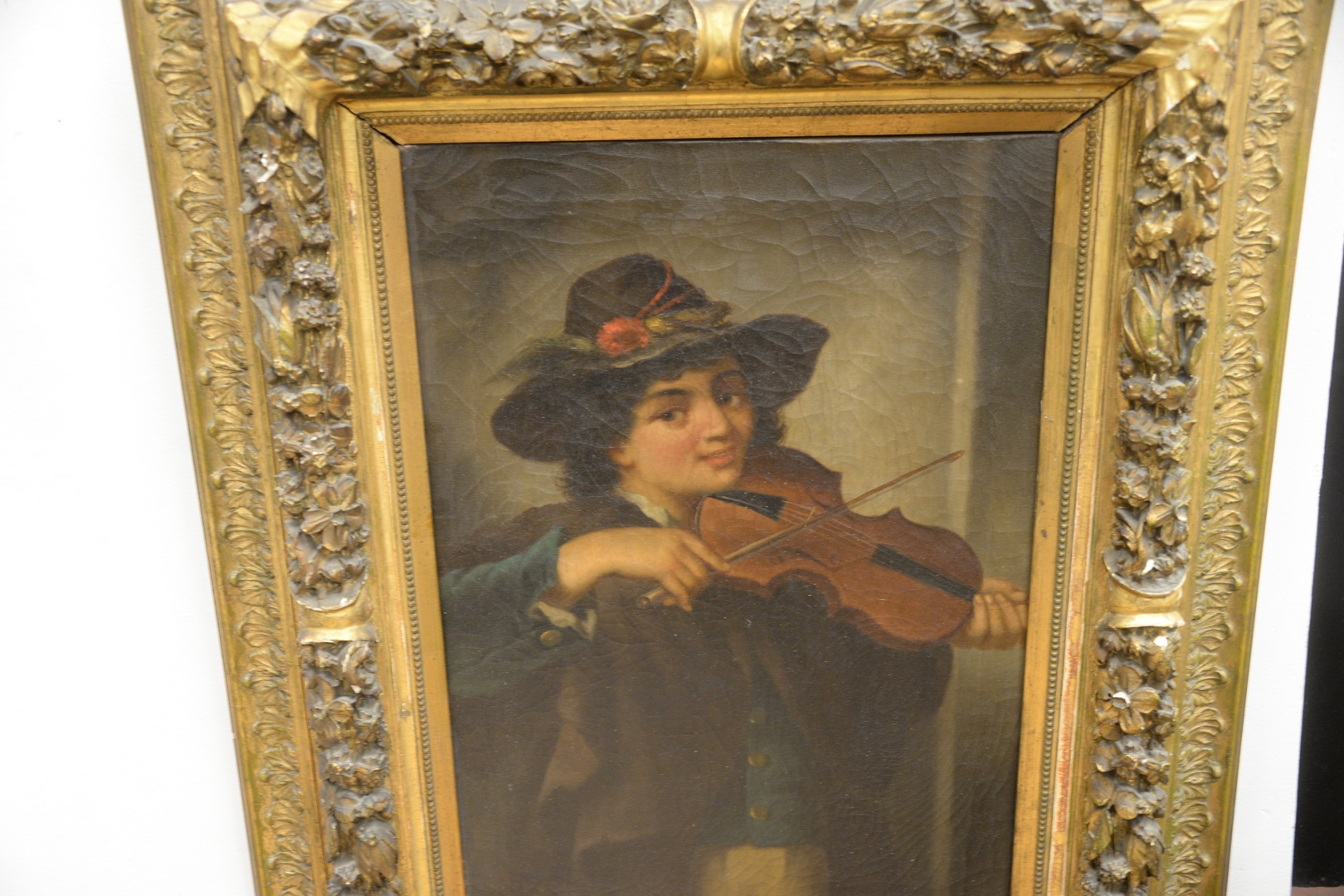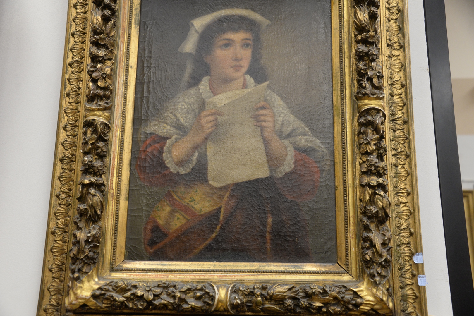 Lot 354: Pair of 19th Century Portraits to include one of a girl holding a letter along with a boy playing a violin, oil on canvas, both signed lower right ‘Benito’, 23 1/2 x 16 1/2.