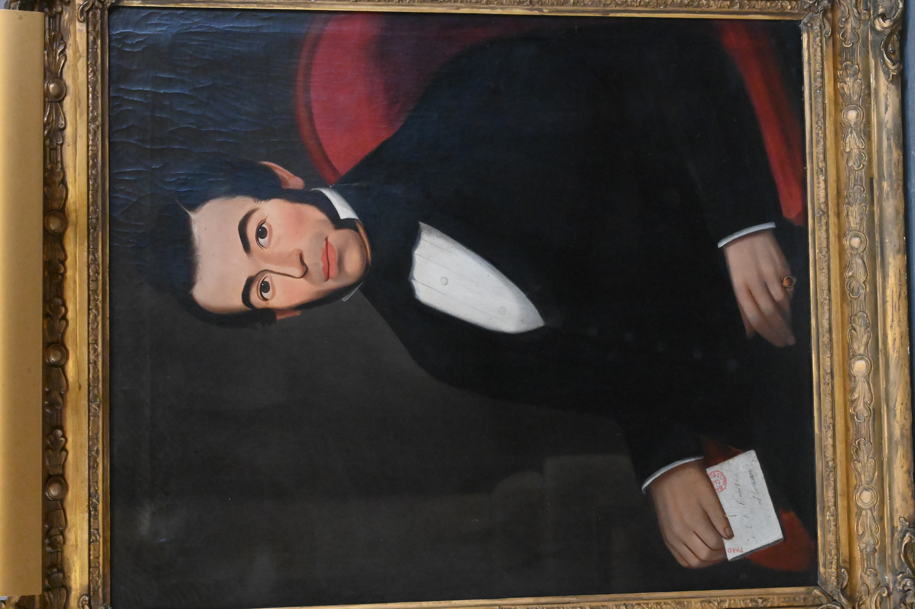 Depicting a gentleman holding a letter and a lady with a book, both seated in red upholstered chairs. The gentleman’s letter bears a red circular postal stamp and illegible name, marked “Baltimore”