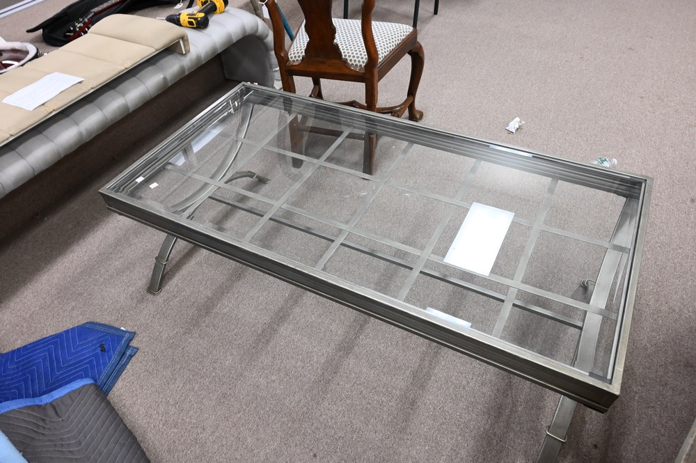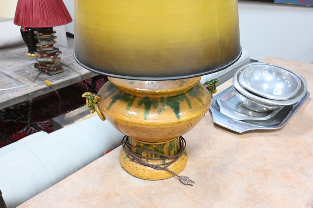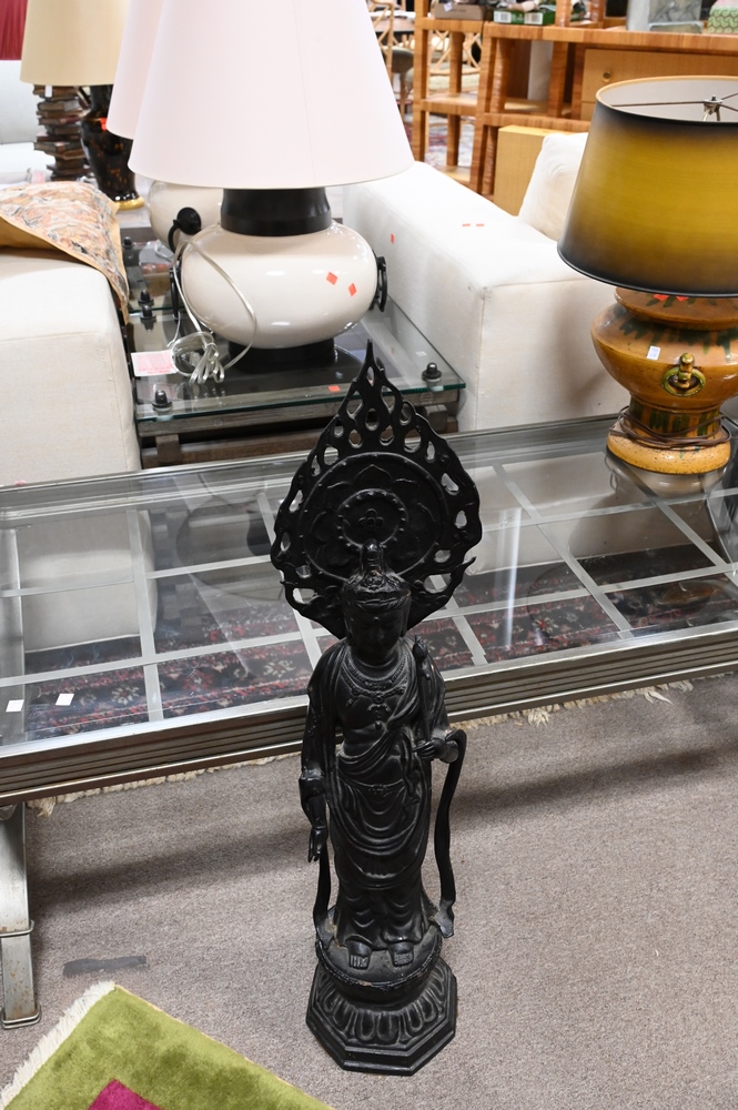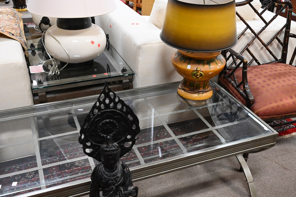Lot 354: Six Piece Lot, to include faux bamboo arm chairsh, along with contemporary glass top coffee table, iron asian figure holding flower, upholstered chair and yellow and green glazed lamp, height 37 1/2 inches, width 26 inches.