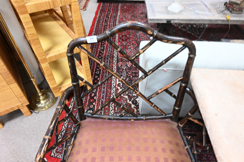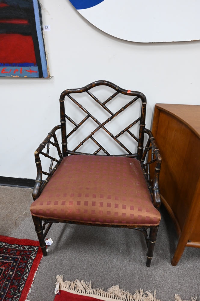 Six Piece Lot, to include faux bamboo arm chairsh, along with contemporary glass top coffee table, iron asian figure holding flower, upholstered chair and yellow and green glazed lamp, height 37 1/2 inches, width 26 inches.