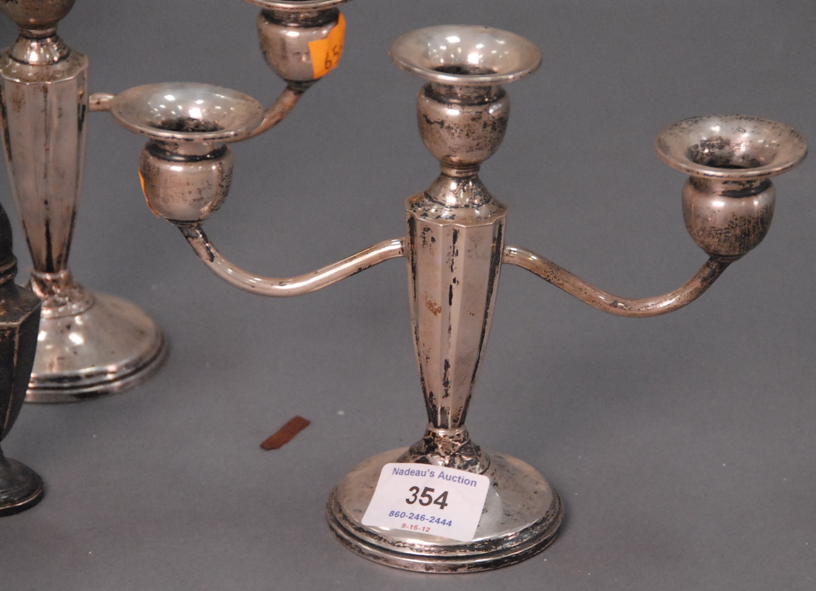 Sterling silver lot small weighted candelabra and small weighted pepper shakers.