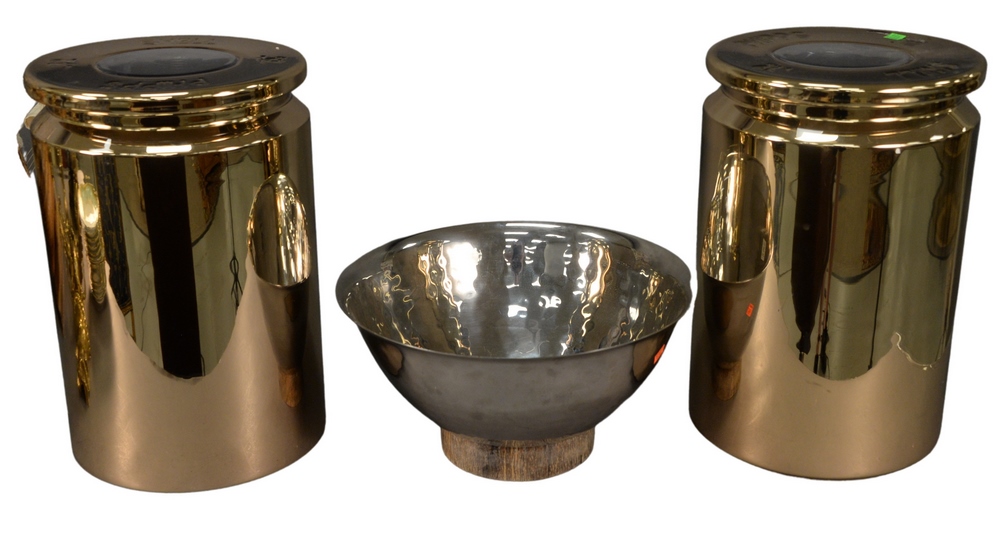 Three Piece Group, to include a pair of Jake Phipps shell stools, both marked to the underside (as is), retail $359 each along with a large Atticus serving bowl, Provenance: David and Cynthia Kim, 22 Stoney Wylde Lane, Greenwich, Connecticut. View home by visiting: https://www.zillow.com/homedetails/22-Stoney-Wylde-Ln-Greenwich-CT-06830/177238281_zpid/.