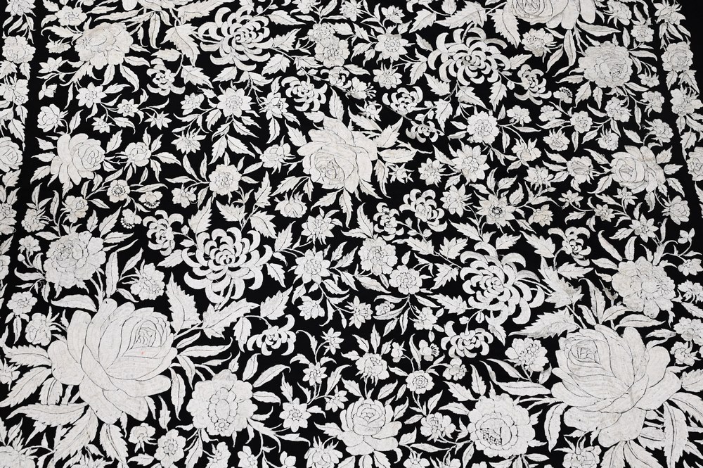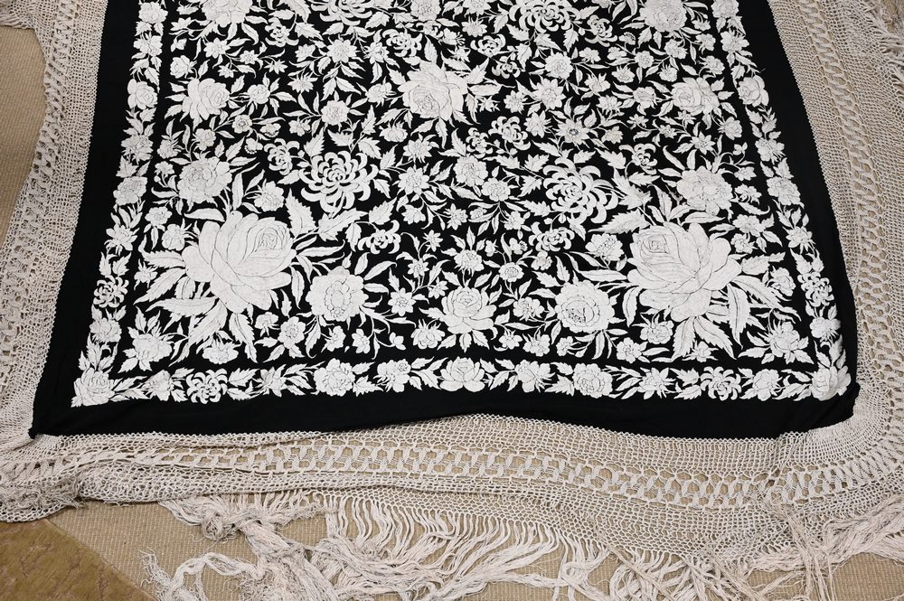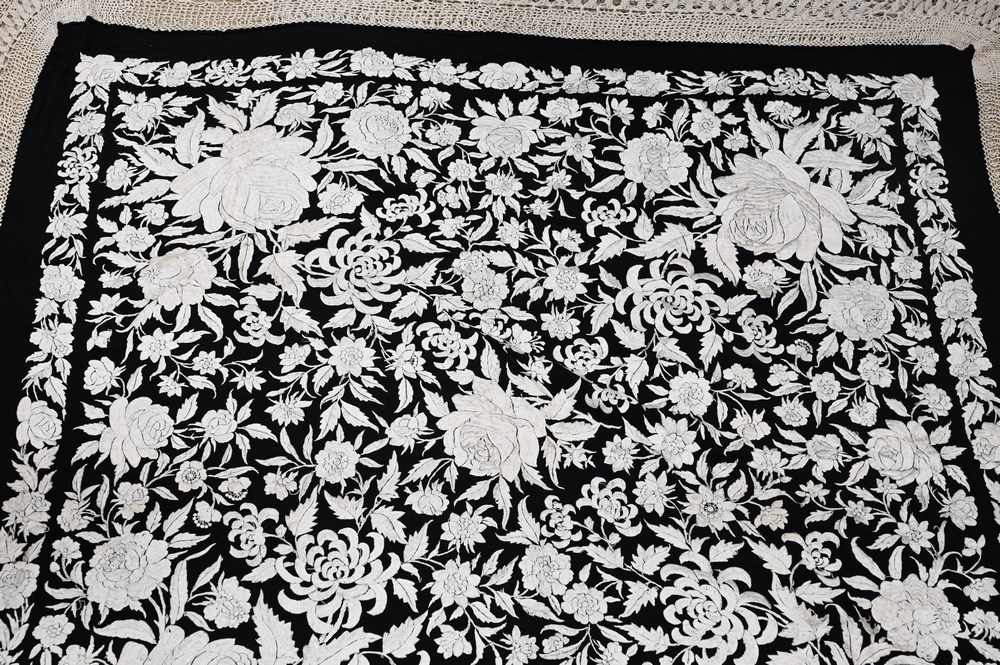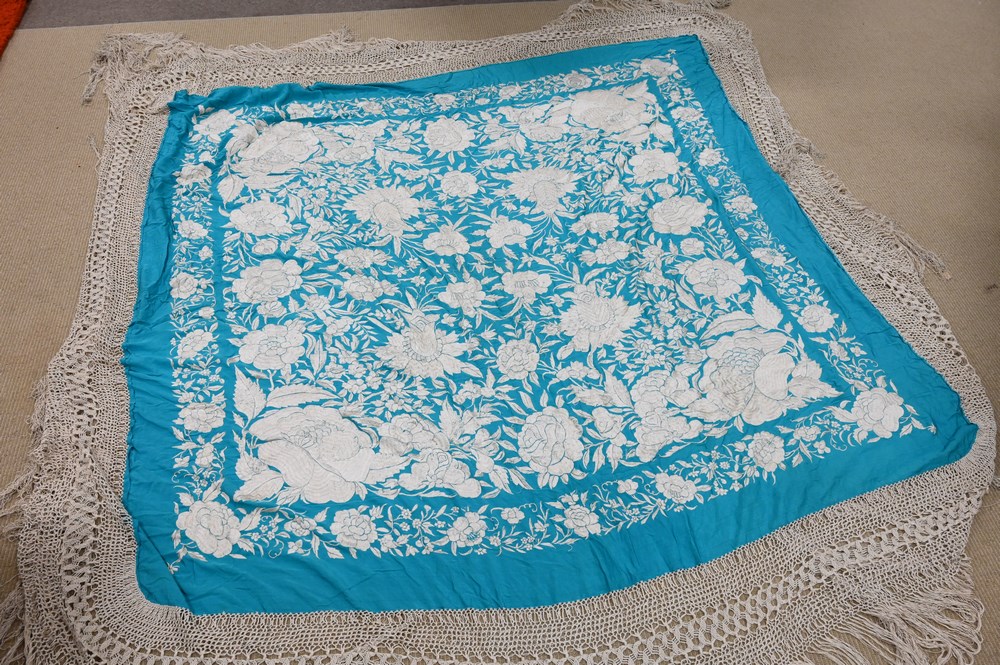 Lot 354: Two Embroidered Silk Piano Shawls, to include one with large flowers; one with black ground and one blue; approximately 6′ 2″ x 6′ 5…