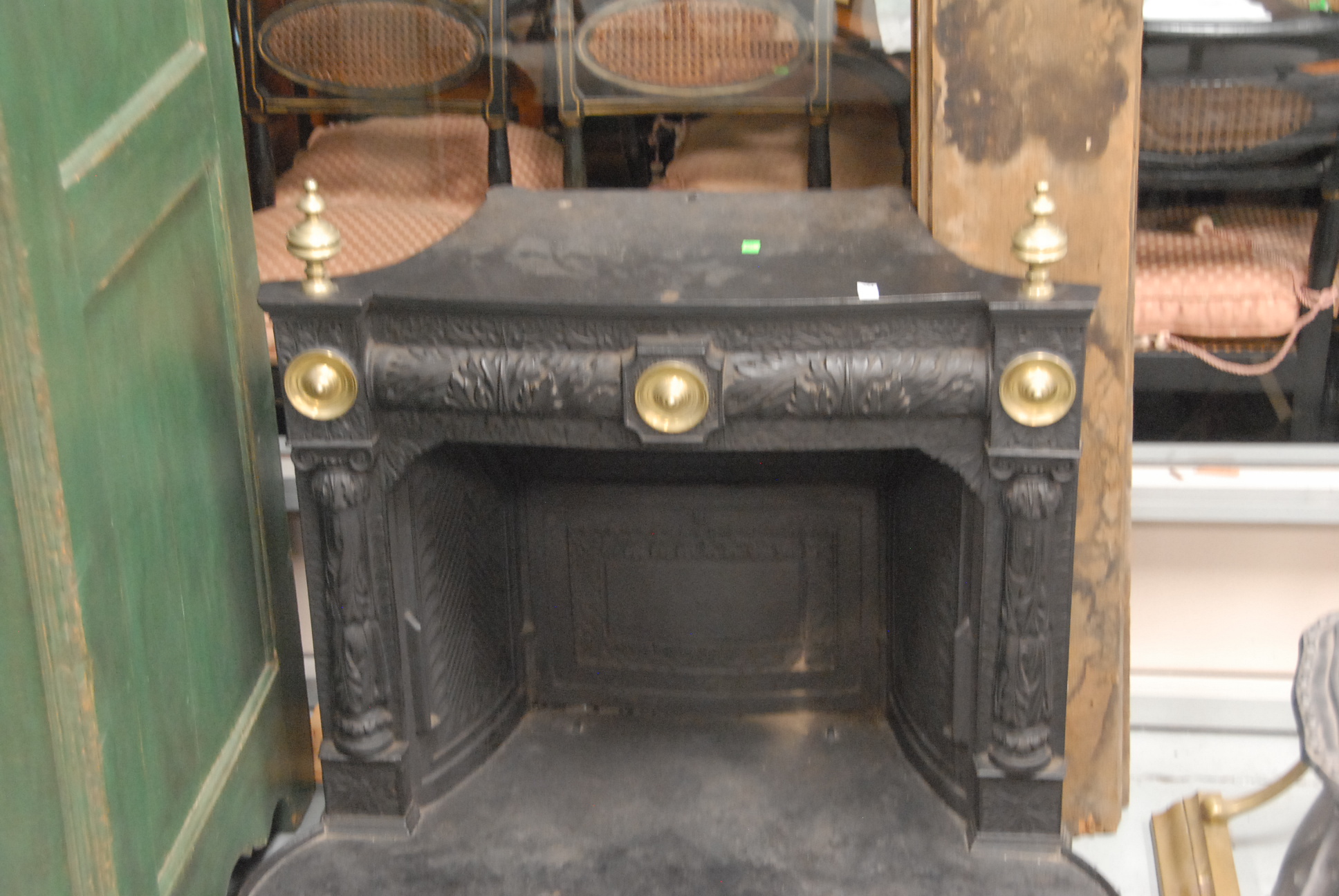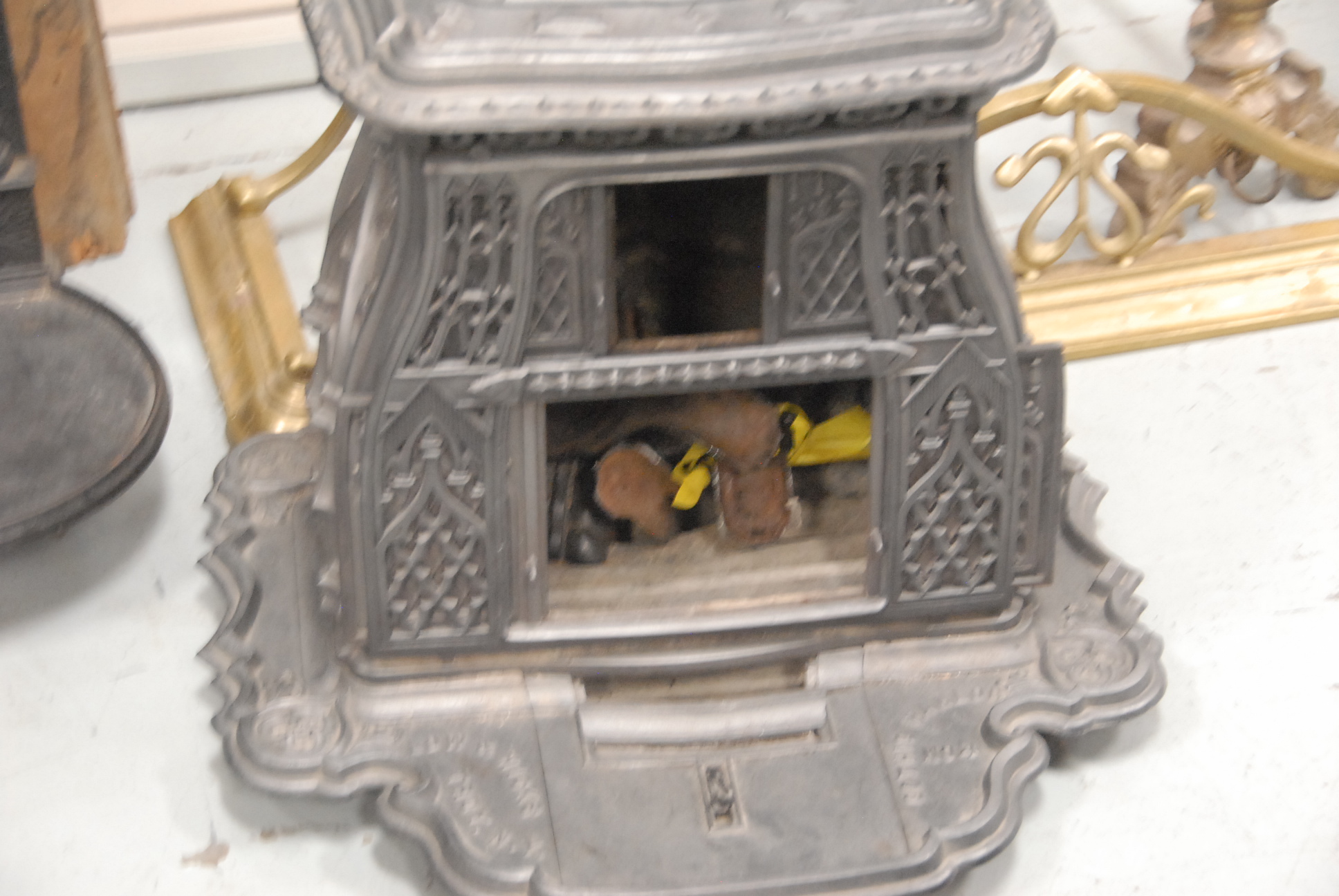 Lot 354: Two iron wood stoves one is insert with brass trim and other is Low and Hicks Troy NY Gothic Parlor No. 4 wood stove. Being sold t…