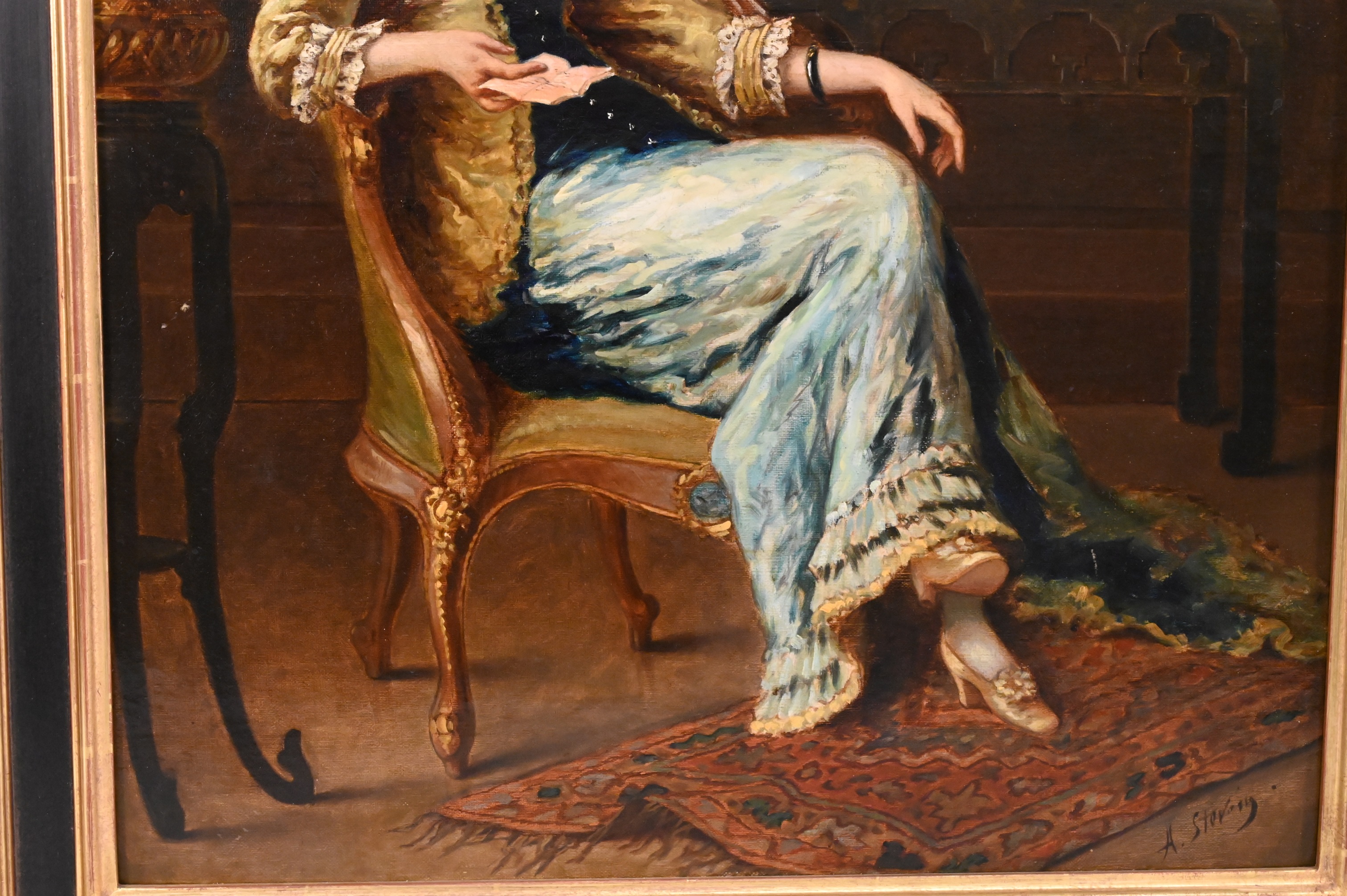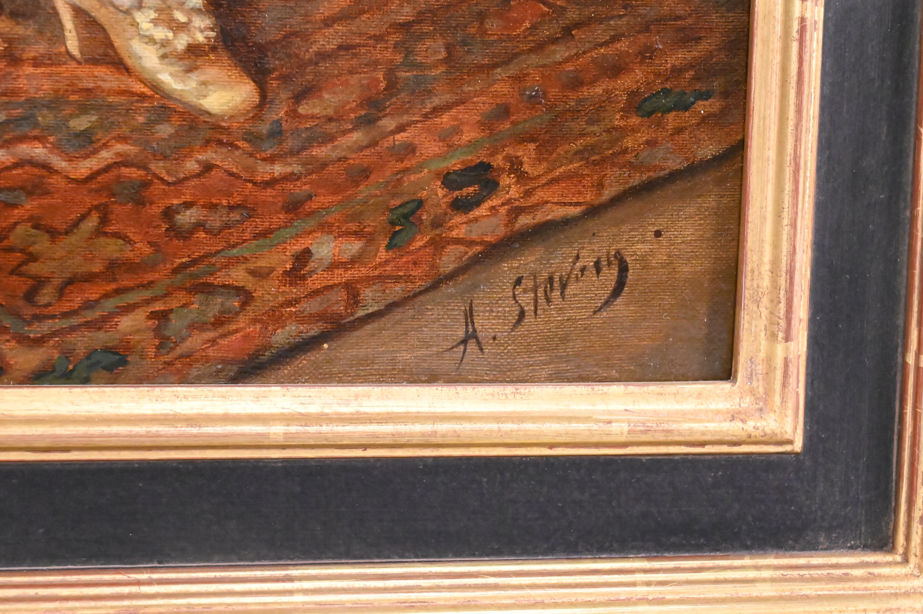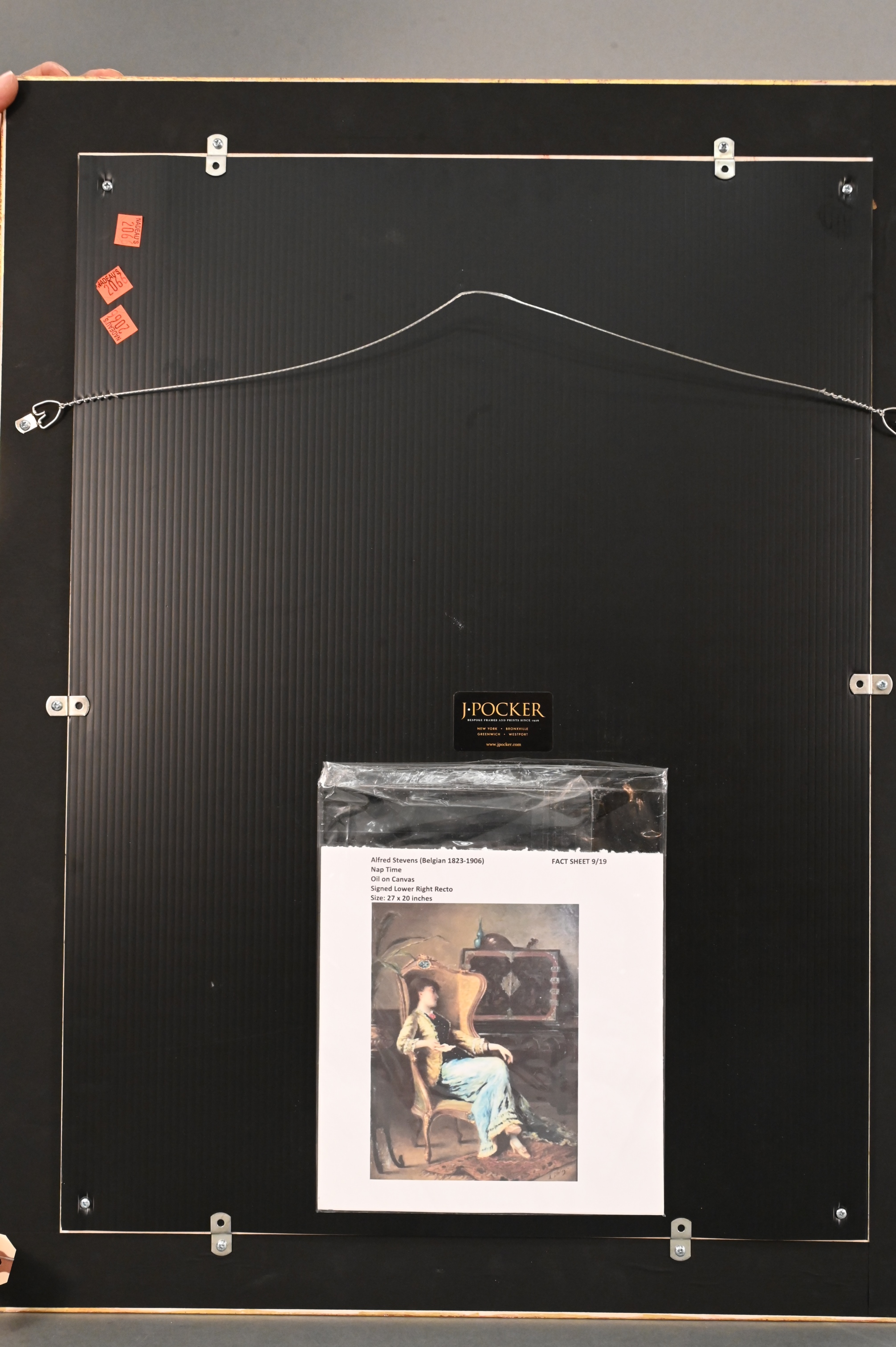 Agapit Stevens (Belgian 1848 – 1924) Genre Painter “Nap Time” oil on canvas signed “A. Stevens” lower right 27″ x 20″.
