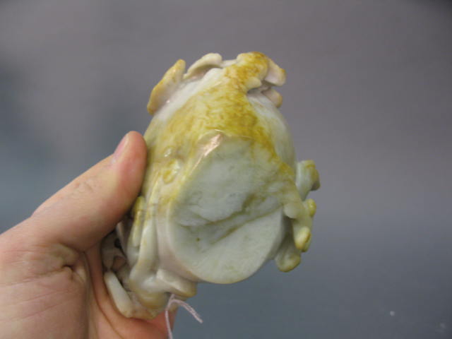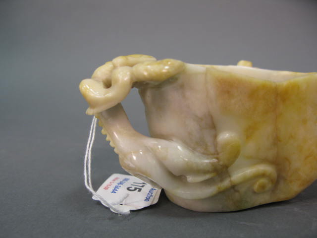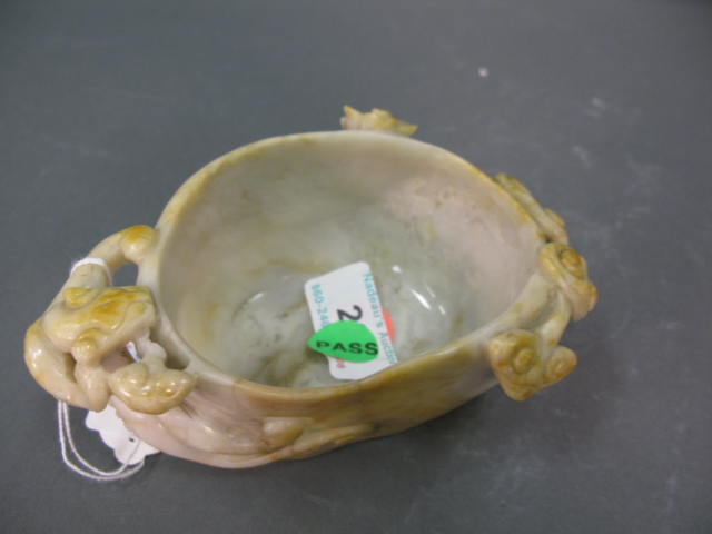 Carved jade handled bowl with carved flowering trees and dragon handle.